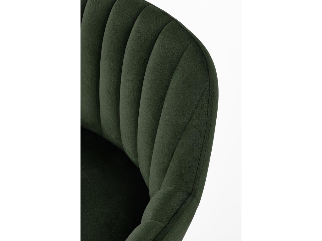 Tato barová židle je čalouněná měkkou sametovou látkou, která příjemně doladí vzhled celku a zároveň poskytuje vysoký komfort při sezení. Integrované područky a ergonomicky tvarované opěradlo zajišťují pohodlí i při delším posezení. Zadní strana opěradla je ozdobena dekorativním prošíváním ve tvaru mušle, které dodává židli jedinečný vzhled.