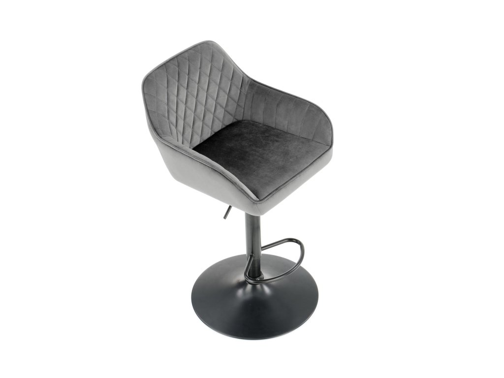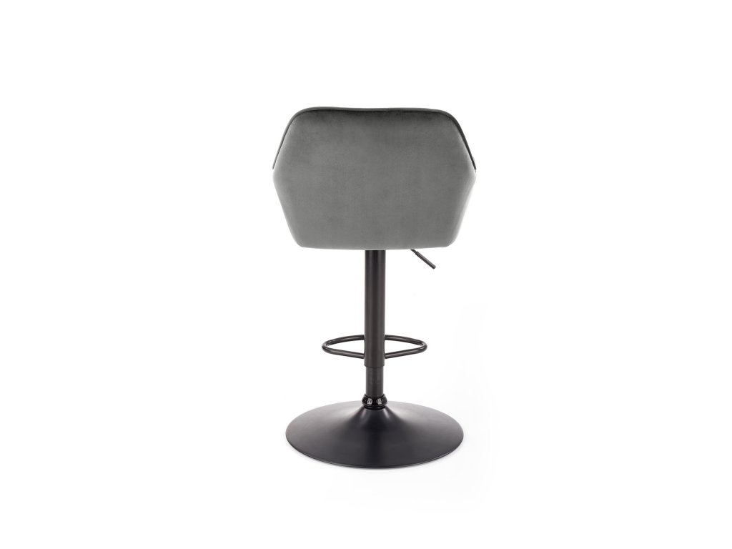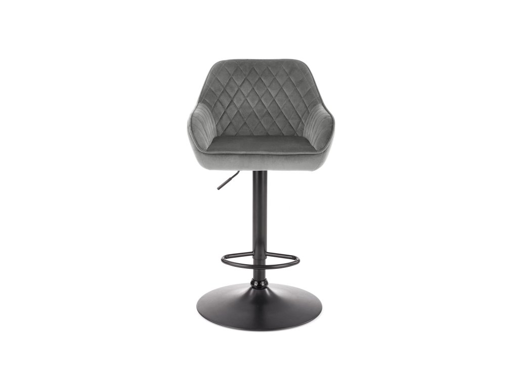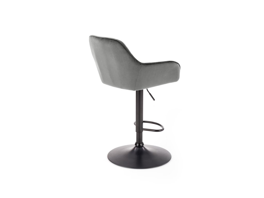 Židle je čalouněná sametovou látkou v šedém odstínu, která působí nadčasově a zároveň je vysoce odolná proti nečistotám. Nastavitelná výška sedu v rozmezí 62–84 cm umožňuje pohodlné přizpůsobení výšce pultu. Kovová konstrukce s praktickou podnožkou poskytuje stabilitu i pohodlí při delším sezení. Nosnost židle je až 120 kg.