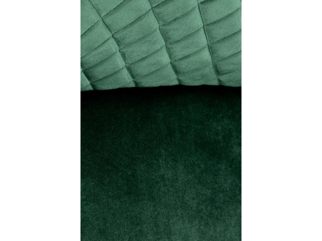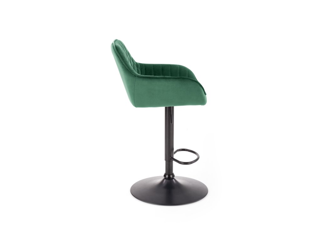 Židle je čalouněná sametovou látkou ve tmavě zeleném odstínu, která působí luxusně a zároveň je vysoce odolná proti nečistotám. Nastavitelná výška sedu v rozmezí 62–84 cm umožňuje snadné přizpůsobení výšce pultu. Kovová konstrukce a stabilní podnožka zajišťují pevnost a komfort při sezení. Nosnost židle je až 120 kg.