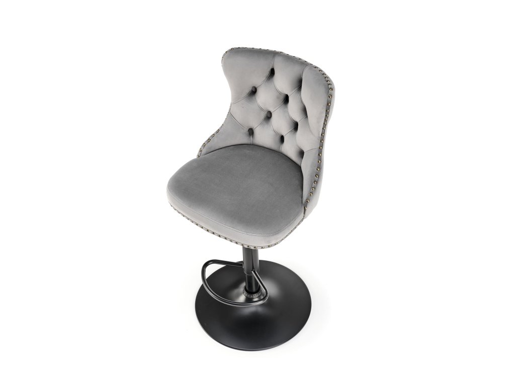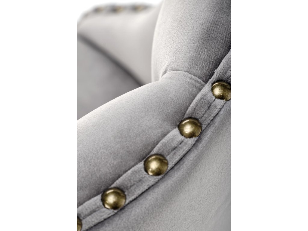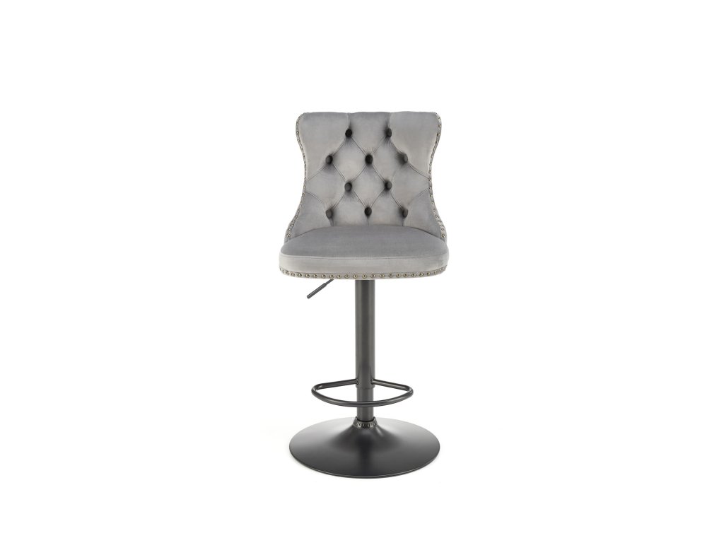Barová židle VM117 je elegantní kus nábytku, který spojuje pohodlí s moderním glamour designem. Čalounění ze šedé sametové látky s prošívaným opěrákem a ozdobnými starožitnými zlatými nýty dodává židli výrazný charakter a vizuální přitažlivost. Sametová tkanina je nejen na pohled luxusní, ale také velmi příjemná na dotek.