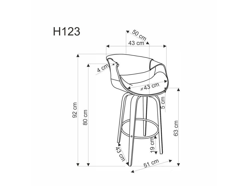 Rozměry: šířka 55 cm, hloubka 51 cm, výška 91 cm, výška sedu 63 cm.