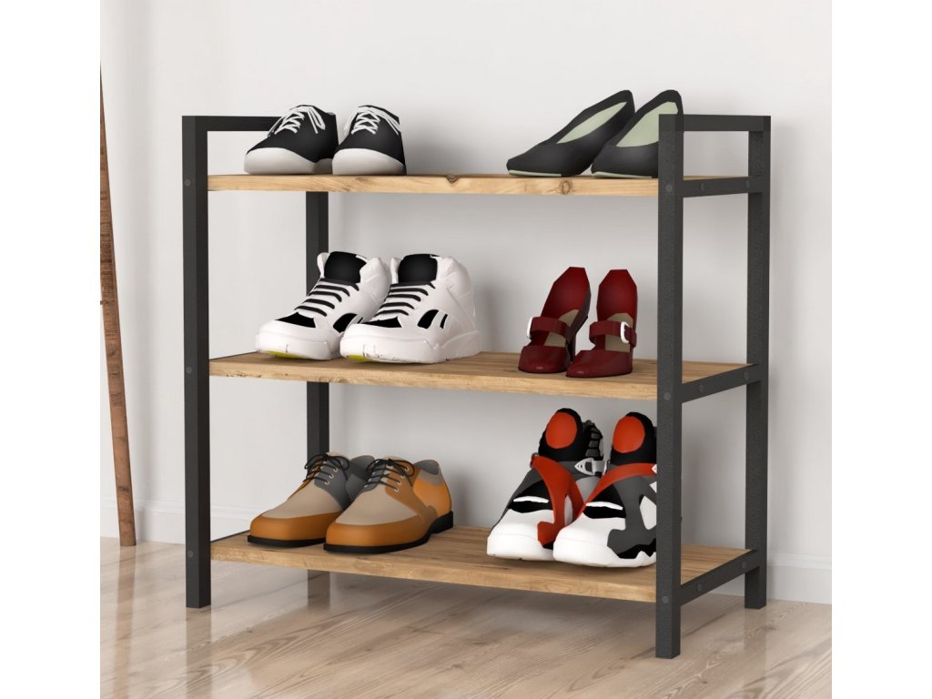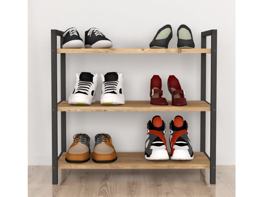 Moderní botník OTTO v kombinaci borovice a černé barvy nabízí elegantní industriální vzhled a praktické řešení pro ukládání obuvi. Jeho pevný kovový rám v matné černé barvě zajišťuje stabilitu, zatímco tři police z kvalitní LTD desky v dekoru borovice poskytují dostatek prostoru pro přehledné uspořádání obuvi a doplňků.