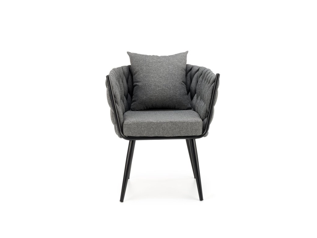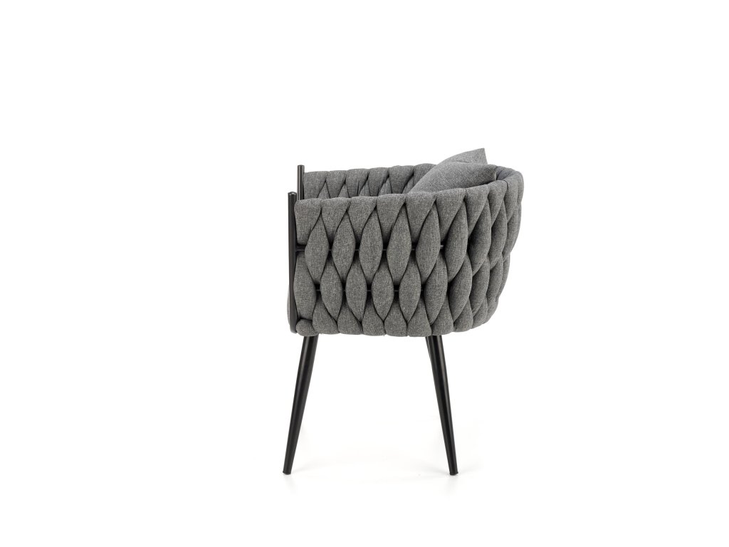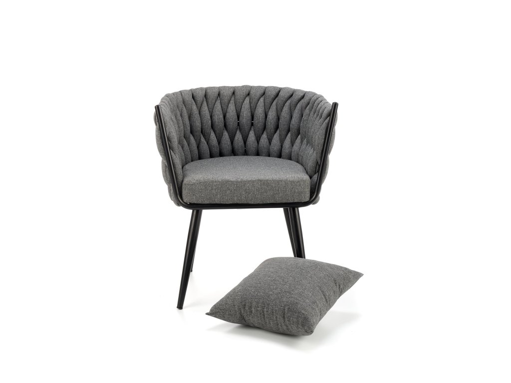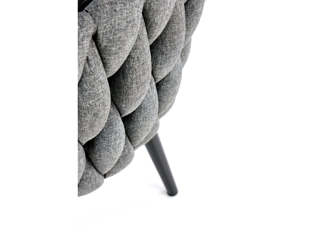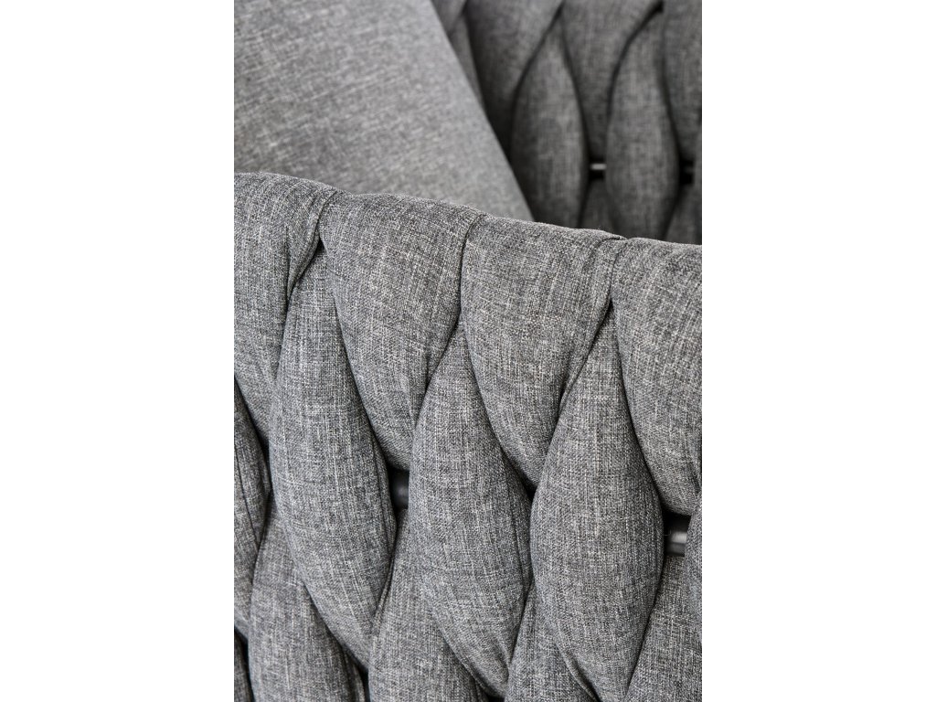 Křeslo je celočalouněné měkkou látkou, která je příjemná na dotek, snadno se udržuje v čistotě a dlouhodobě si zachovává svůj estetický vzhled. Zaoblené bočnice s dekorativním proplétaným vzorem dodávají křeslu jedinečný charakter, zatímco černé práškově lakované ocelové nohy zajišťují stabilitu a pevnost.