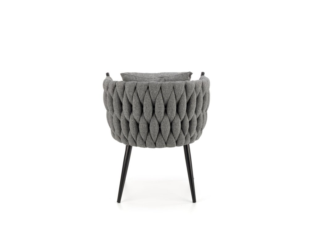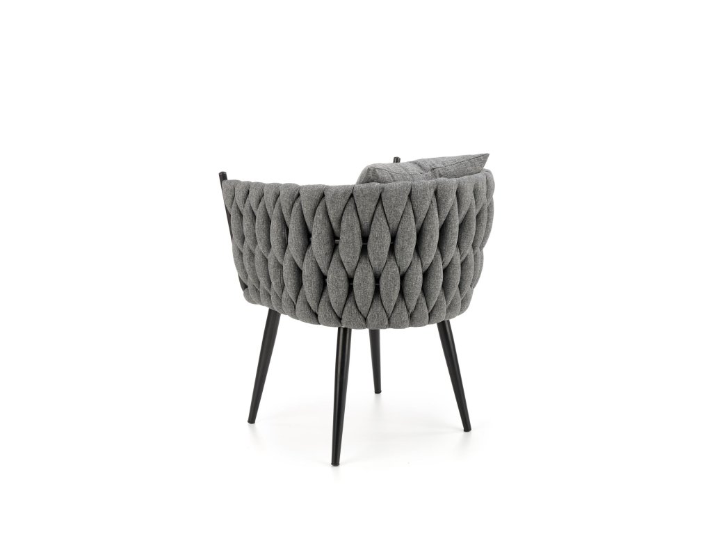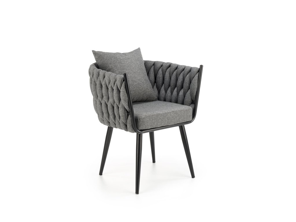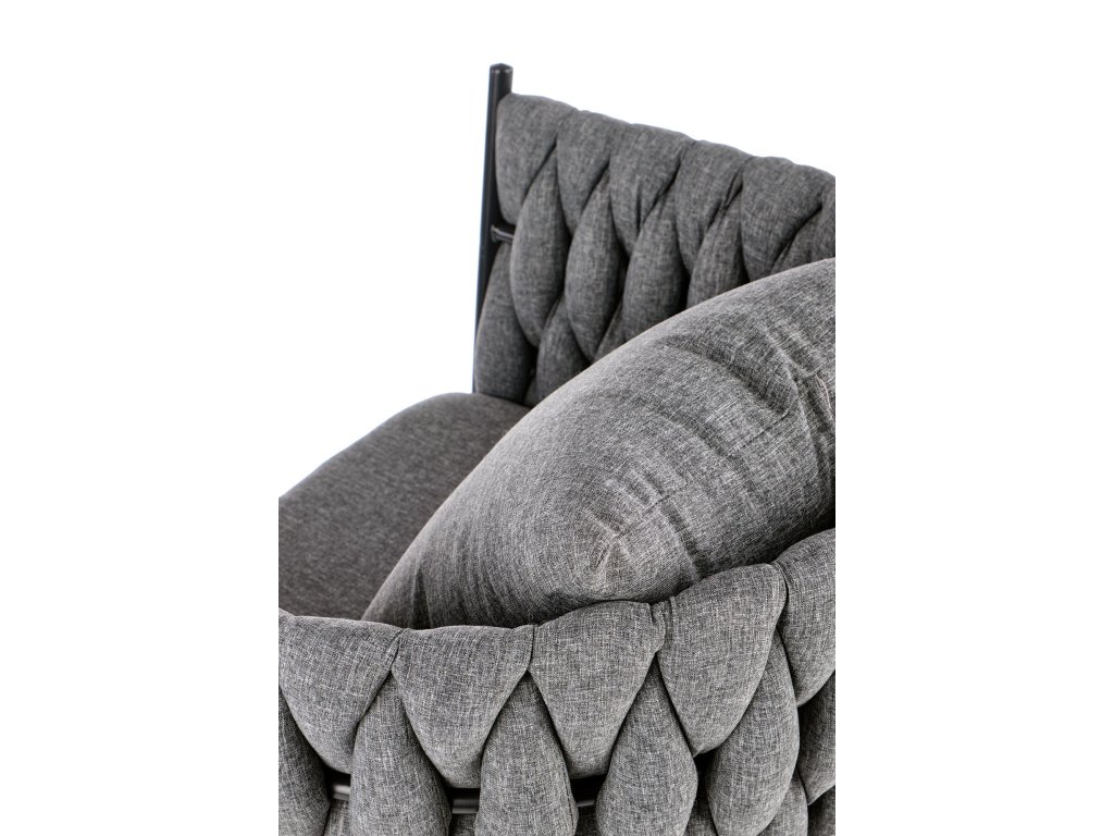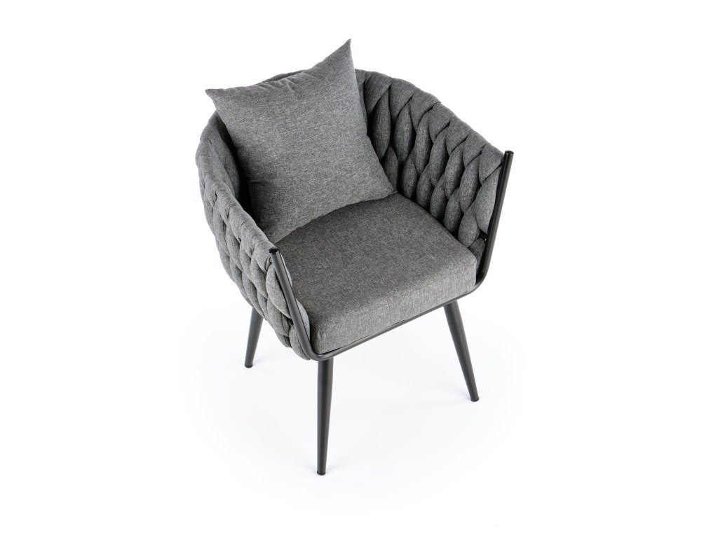 Křeslo je celočalouněné měkkou látkou, která je příjemná na dotek, snadno se udržuje v čistotě a dlouhodobě si zachovává svůj estetický vzhled. Zaoblené bočnice s dekorativním proplétaným vzorem dodávají křeslu jedinečný charakter, zatímco černé práškově lakované ocelové nohy zajišťují stabilitu a pevnost.