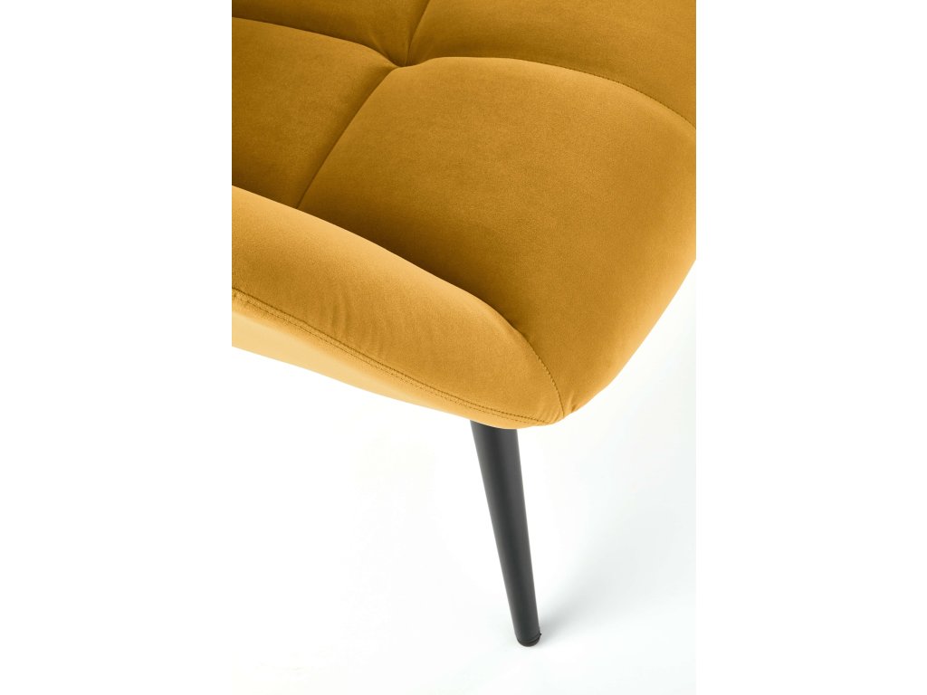 Sametový potah v hořčicovém odstínu vyniká svou sytostí a jemným leskem, který odráží světlo a oživuje celkový vzhled interiéru. Prošívané opěradlo a sedák dodávají křeslu na vizuální atraktivitě a podtrhují jeho moderní charakter. Vysoká opěrka zad a područky poskytují oporu i při delším sezení, zatímco ocelová konstrukce zajišťuje stabilitu a odolnost.