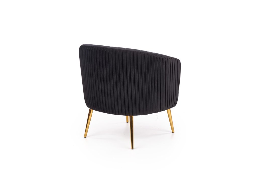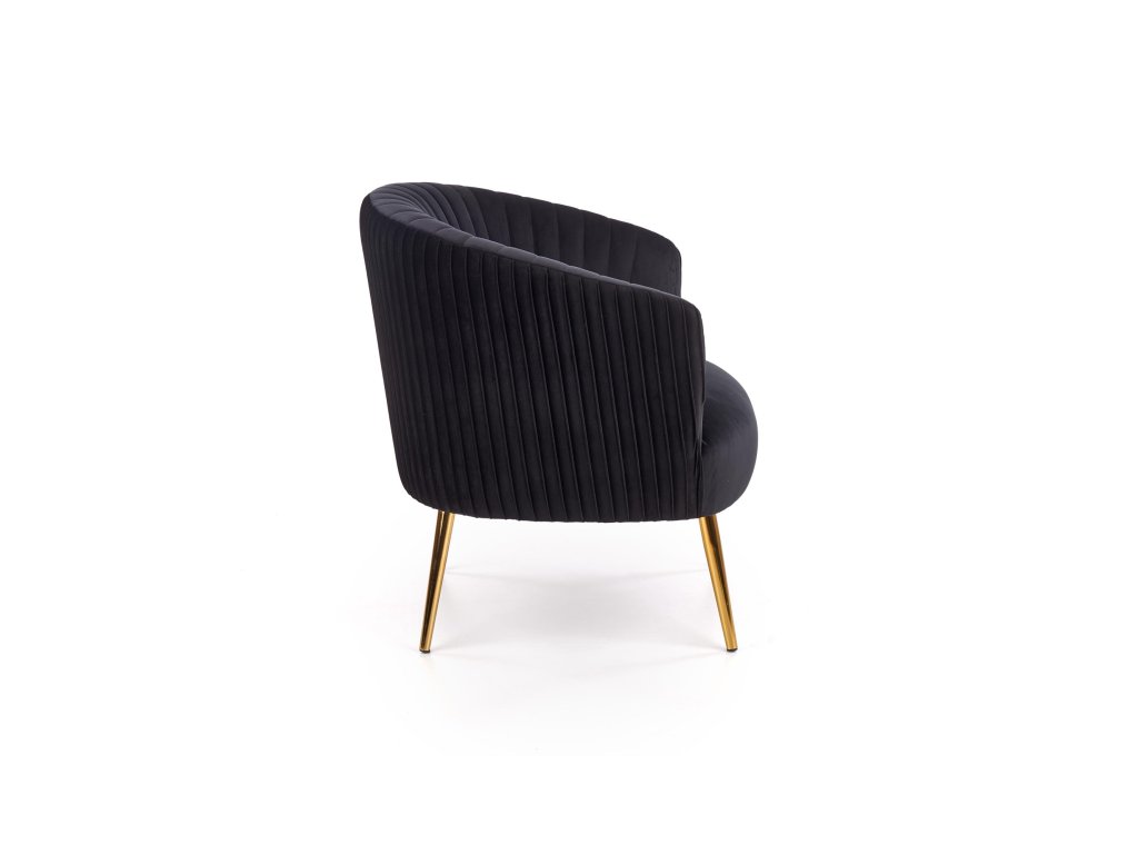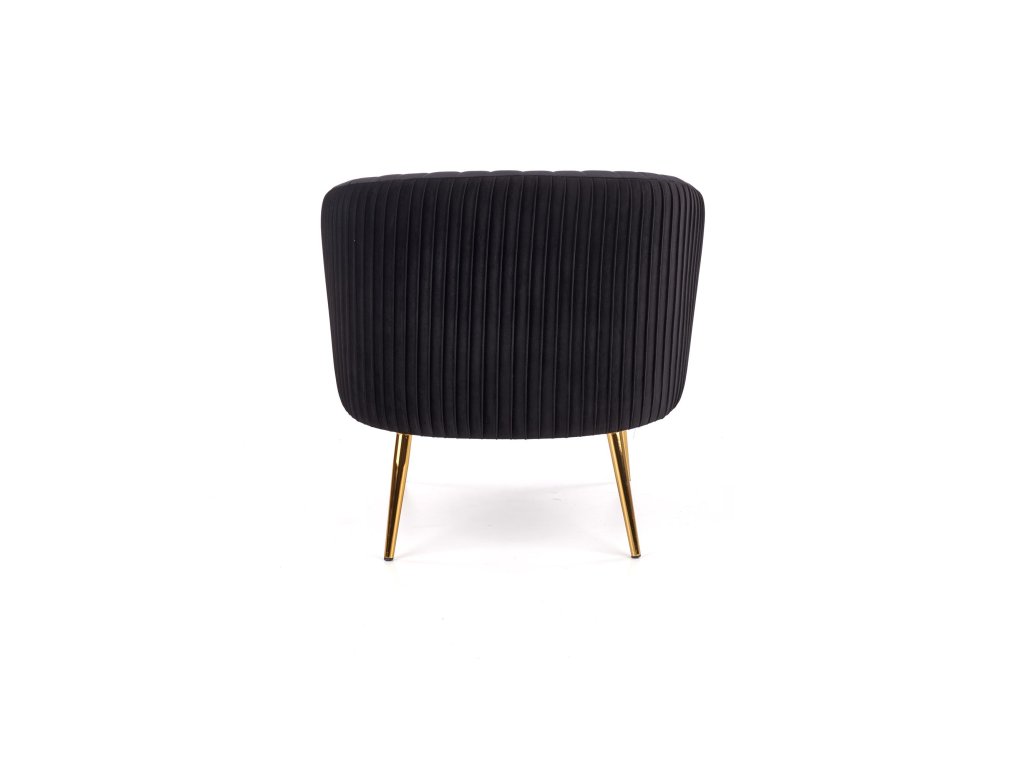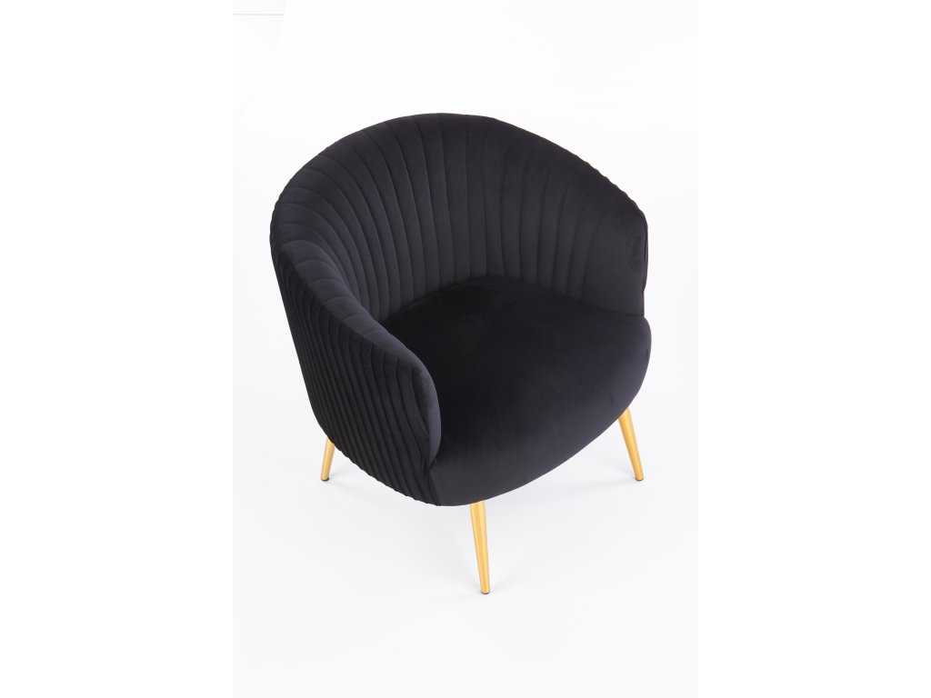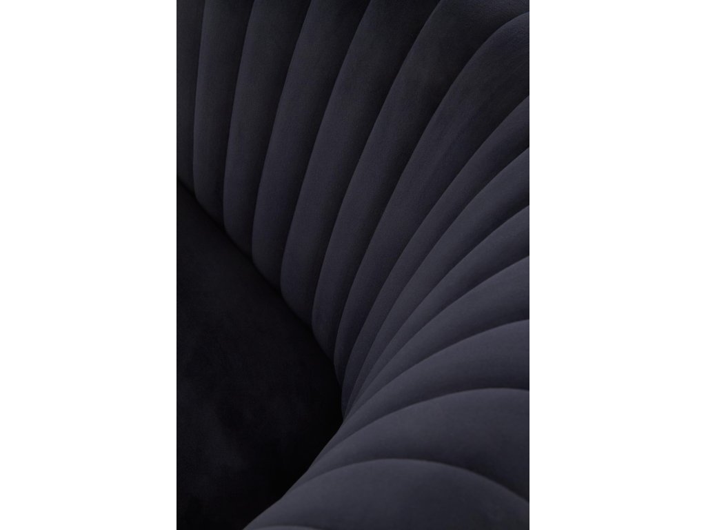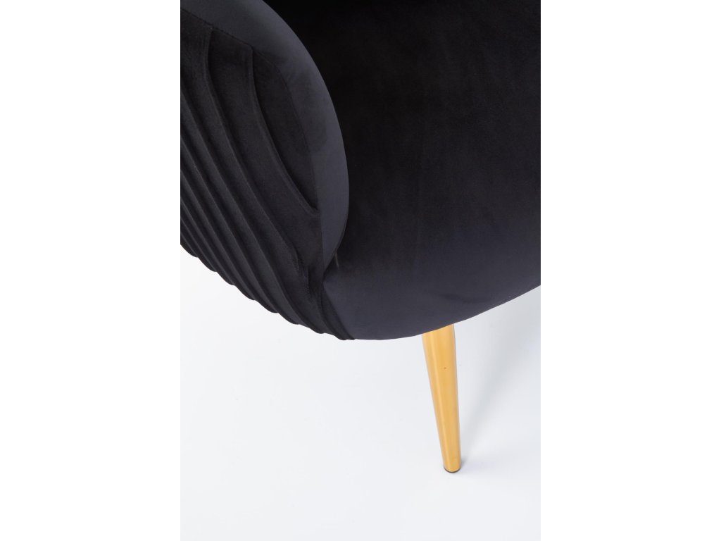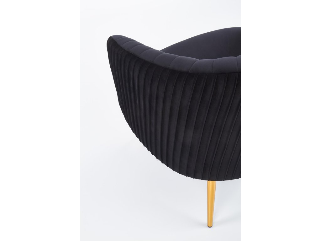 Čalouněné křeslo SHEMAR v elegantní černé barvě představuje ideální spojení luxusu, komfortu a moderního designu. Čalounění z měkké sametové látky je příjemné na dotek a dodává křeslu jedinečný vzhled. Zlaté chromované ocelové nohy zajišťují pevnost a dodávají celku jemný lesk. Nízké opěradlo s vertikálním prošíváním a zaobleným tvarem perfektně ladí s aktuálními interiérovými trendy, aniž by prostor zahltil.