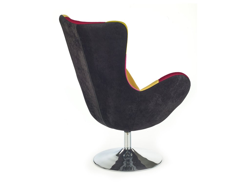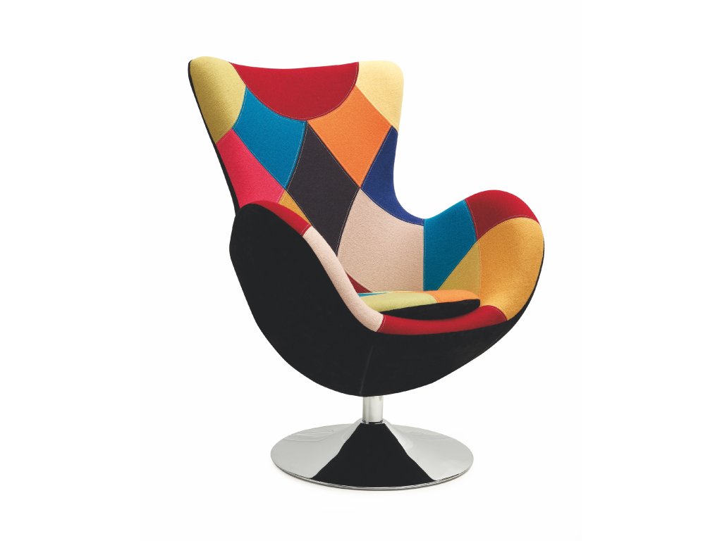 Potažené látkou připomínající vlnu, křeslo zaujme kombinací barevných záplat, které vytvářejí živý, ale zároveň vyvážený vizuální dojem. Komfort zajišťuje ergonomicky tvarovaný sedák s přídavným polštářem, který podporuje pohodlí při dlouhodobém sezení. Robustní podnož z chromované oceli nabízí stabilitu a zároveň umožňuje otáčení.