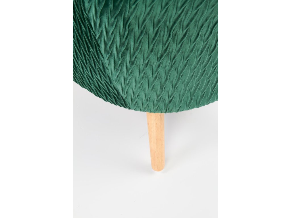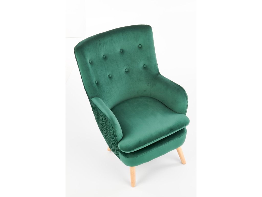 Křeslo je potažené kvalitní sametovou látkou s jemným leskem, která podtrhuje jeho sofistikovaný vzhled. Prošívání s dekorativními knoflíky na opěradle dodává křeslu jedinečný charakter a eleganci. Masivní dřevěné nohy v přírodním odstínu zajišťují pevnost a stabilitu.