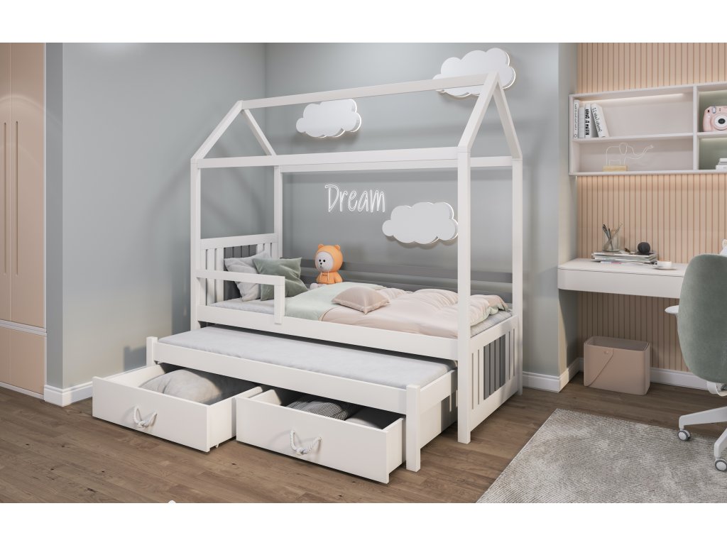 Dětská postel domeček s přistýlkou CLAUDIA II 90X200 + ROŠTY a ZÁSUVKY v ceně