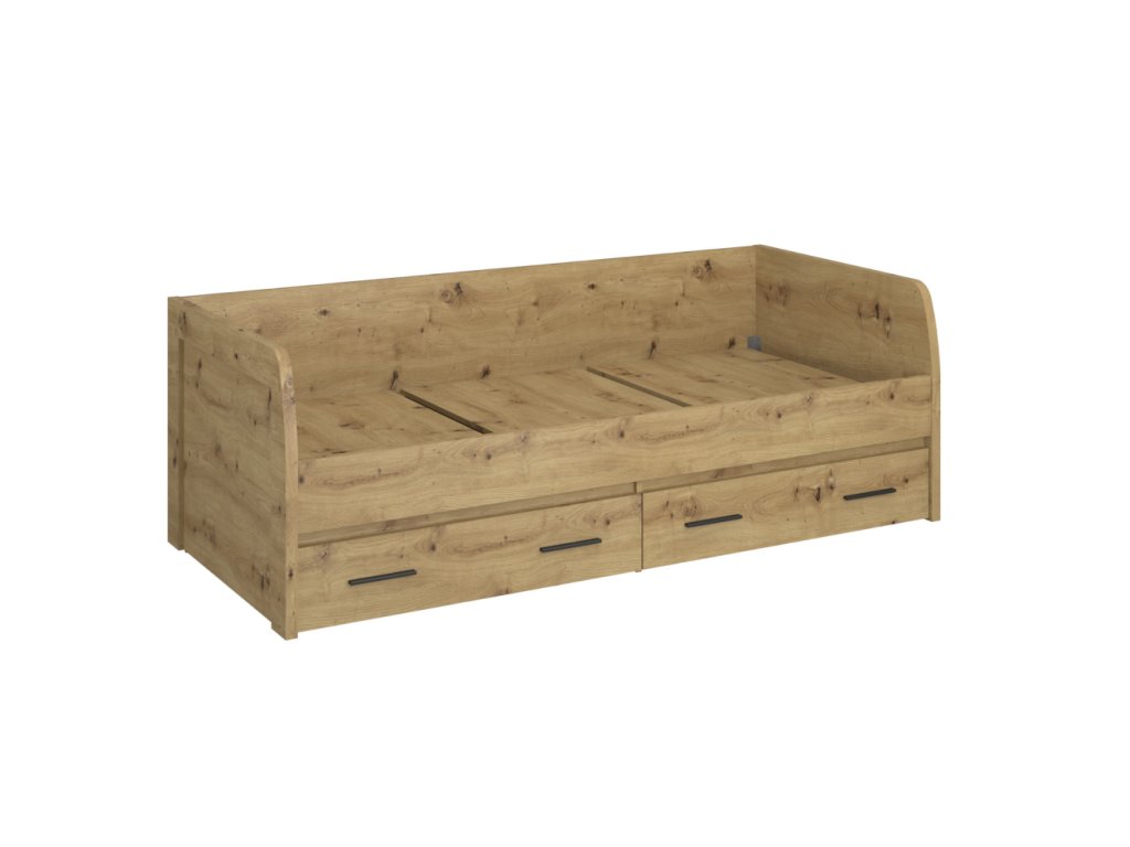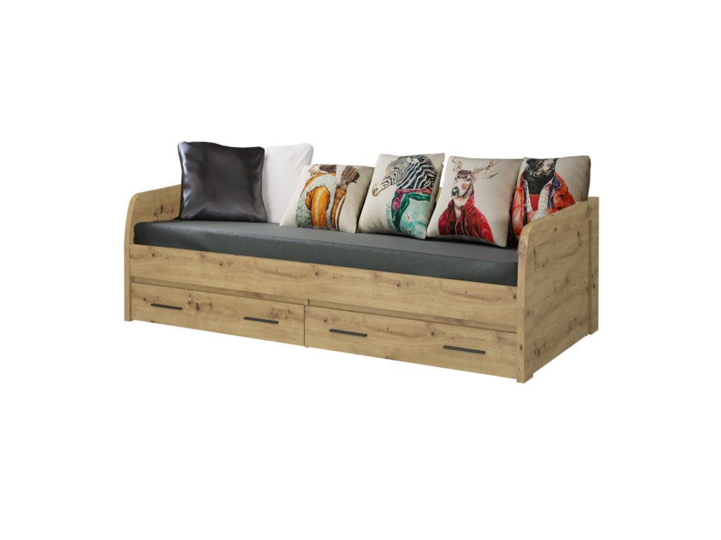 Postel je dodávána s roštem a plastovými nožičkami, což zajišťuje pevnou konstrukci a snadnou montáž. Matrace není součástí, ale lze ji snadno dokoupit z nabídky vhodných matrací. Moderní design v barvě dub artisan se hodí do různých typů dětských a studentských pokojů a spojuje estetiku s funkčností.