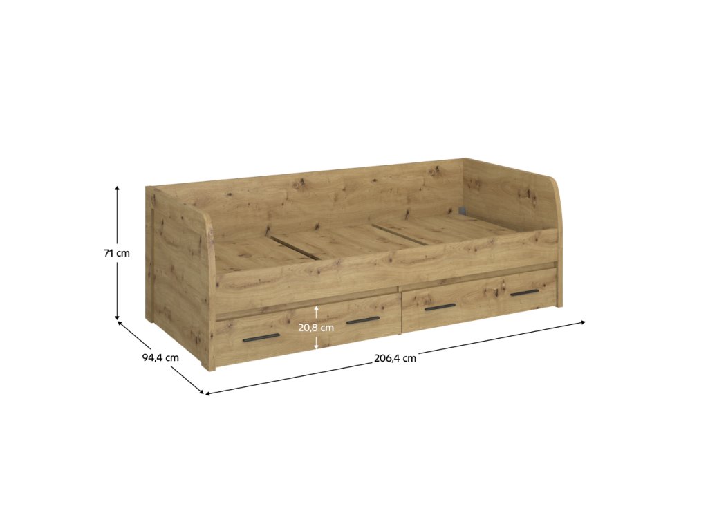 Díky dvěma prostorným šuplíkům o výšce 20,8 cm nabízí snadné a přehledné uložení hraček, povlečení nebo oblečení. Rozměry 94,4 × 206,4 × 71 cm a spací plocha 90 × 200 cm poskytují komfortní místo pro spánek a odpočinek. Nosnost až 120 kg umožňuje bezpečné používání i pro starší děti.