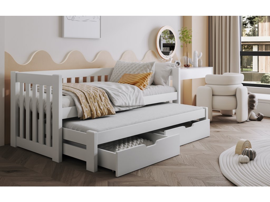 Postel s výsuvnou přistýlkou je elegantní a funkční řešení do každého pokoje. Tento model je navržen s důrazem na kvalitu, jednoduchost a nadčasový design, díky čemuž skvěle zapadne do moderních i klasických interiérů.