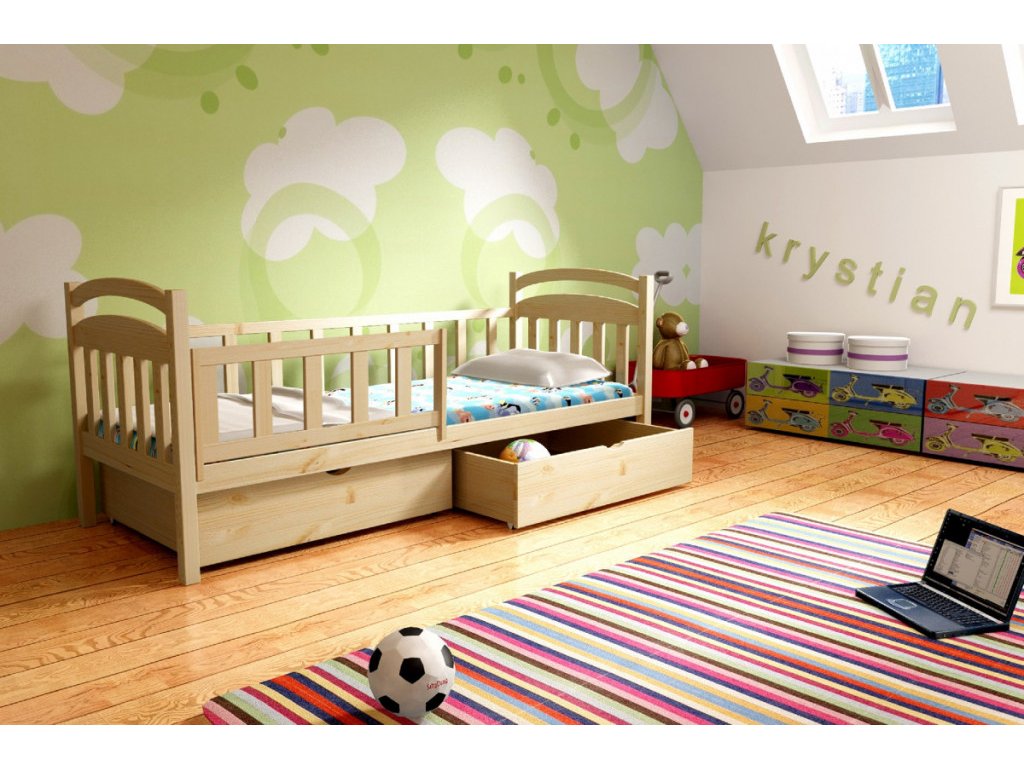 Masivní postel z borovice s pevnou konstrukcí a nosností až 120 kg. Součástí je laťový rošt a odnímatelná, variabilní zábrana s možností umístění na pravou i levou stranu. Postel nabízí praktický prostor pod lůžkem a je vyrobena z kvalitního masivu o síle 2,6 cm se snadnou montáží. K dispozici v provedení bezbarvý lak, moření nebo bílá barva.
