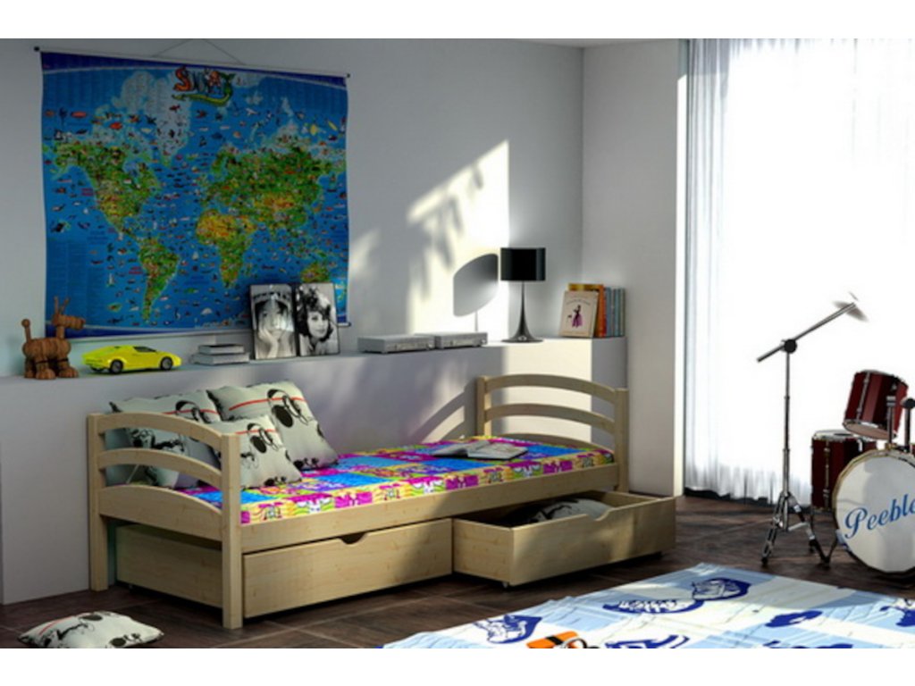 Produkt zahrnuje pouze vyobrazenou postel se zábranou a laťovým roštem. Zásuvky, matrace, doplňky a textilie nejsou součástí balení. Postel je dodávána v demontovaném stavu.