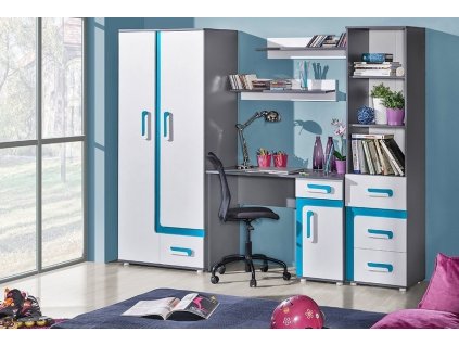 Dětský pokoj FLUXOR – bílá / tyrkys Proměňte dětský pokoj ve funkční a stylový prostor s nábytkem FLUXOR v kombinaci bílé a tyrkysové barvy. Tento moderní nábytek spojuje...