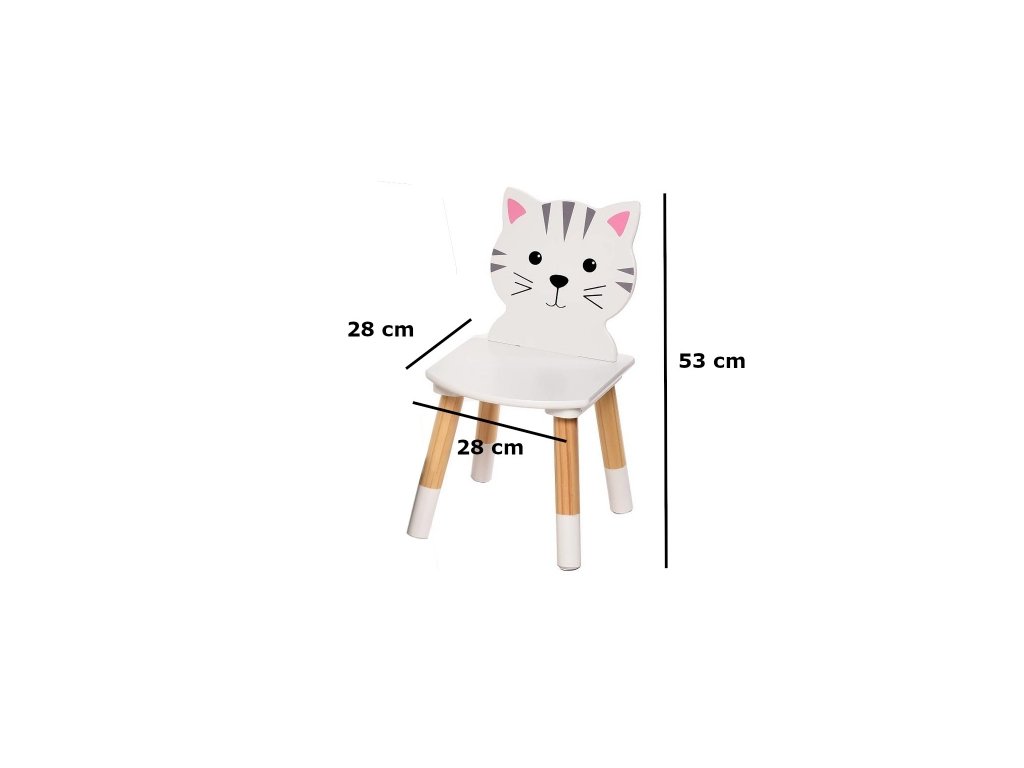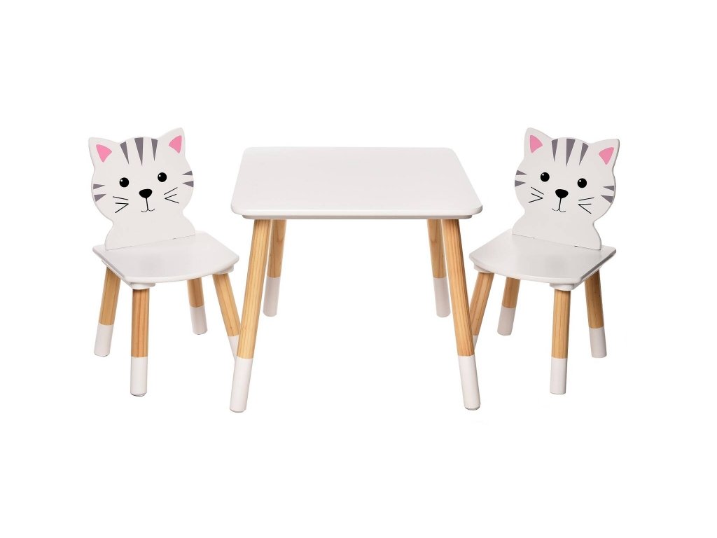 Nádherný dětský stůl v bílém provedení s židličkami s motivem kočiček. Stoleček je ideálním místem pro hraní, malování, občerstvení nebo pro posezení s kamarády. Originální doplněk do dětského pokoje, praktický, přizpůsobený dětským potřebám. Nábytek je stabilní, snadno se čistí. Vhodný pro děti od 2 let. Vlastnosti velmi silná a stabilní konstrukce snadno sestavitelná zaoblené rohy (větší bezpečnost dětí) max. nosnost stolu do 20 kg max. nosnost židličky do 25 kg Materiál MDF deska nohy z borového dřeva Rozměry stůl 50 x 50 x 44 cm židle 28 x 28 x 53 cmDoplňkové parametry