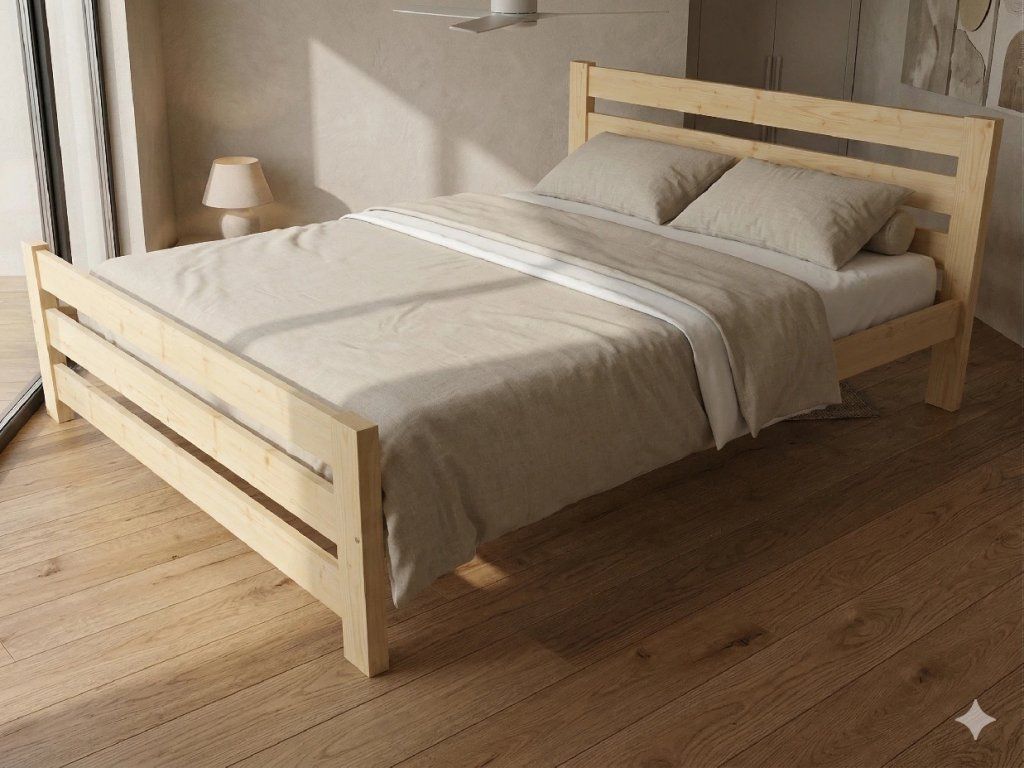 Dřevěná postel 120x200 cm z masivní borovice – VMK11D nabízí pevnost, komfort a přírodní eleganci. Je ideální pro menší ložnice, studentské pokoje nebo hostinské místnosti, kde je důležitá stabilita a dlouhá životnost. Postel je dodávána včetně laťového roštu