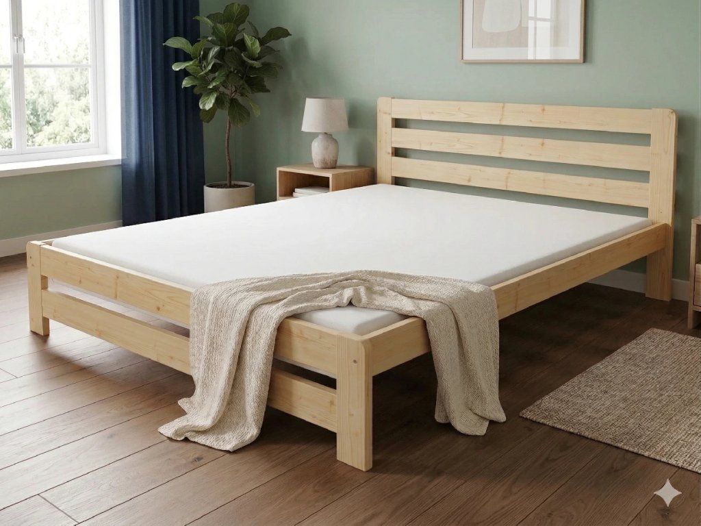 Dřevěná postel 140x200 cm z masivní borovice – VMK1B nabízí pevnost, komfort a přírodní eleganci. Je ideální pro menší ložnice, studentské pokoje nebo hostinské místnosti, kde je důležitá stabilita a dlouhá životnost. Postel je dodávána včetně laťového roštu