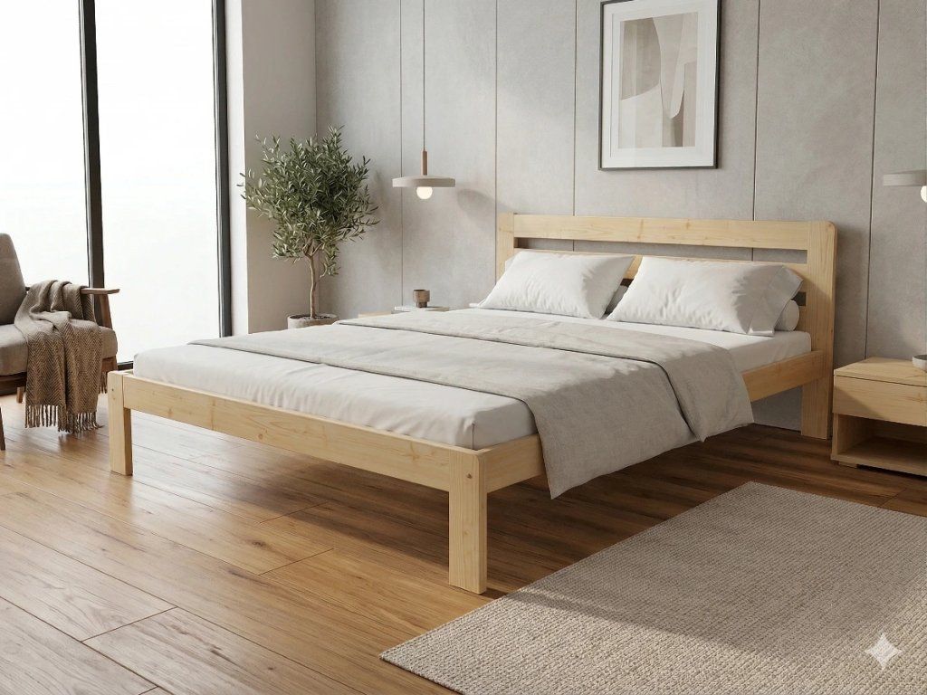 Dřevěná postel 180x200 cm z masivní borovice – VMK1A nabízí pevnost, komfort a přírodní eleganci. Je ideální pro menší ložnice, studentské pokoje nebo hostinské místnosti, kde je důležitá stabilita a dlouhá životnost. Postel je dodávána včetně laťového roštu