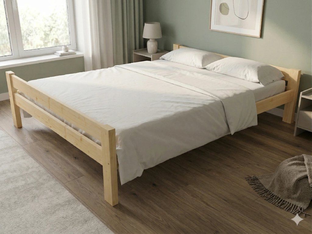 Dřevěná postel 200x200 cm z masivní borovice – VMK13C nabízí pevnost, komfort a přírodní eleganci. Je ideální pro menší ložnice, studentské pokoje nebo hostinské místnosti, kde je důležitá stabilita a dlouhá životnost. Postel je dodávána včetně laťového roštu