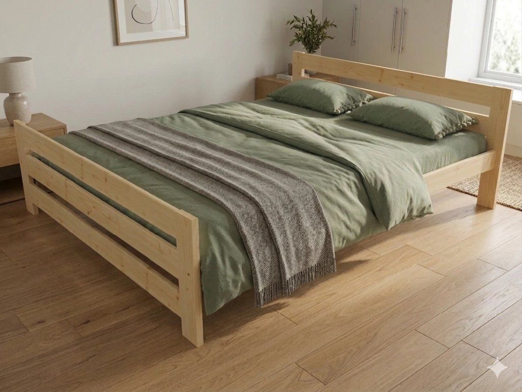 Dřevěná postel 200x200 cm z masivní borovice – VMK5D nabízí pevnost, komfort a přírodní eleganci. Je ideální pro menší ložnice, studentské pokoje nebo hostinské místnosti, kde je důležitá stabilita a dlouhá životnost. Postel je dodávána včetně laťového roštu