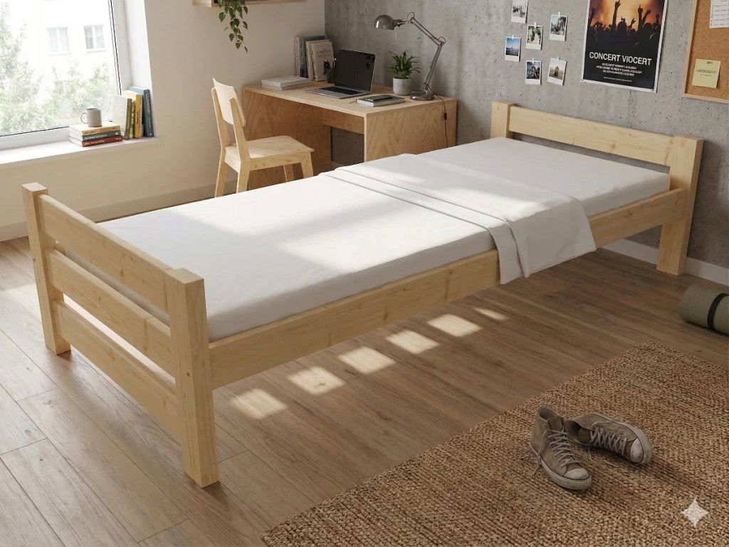 Dřevěná postel 90x200 cm z masivní borovice – VMK13D nabízí pevnost, komfort a přírodní eleganci. Je ideální pro menší ložnice, studentské pokoje nebo hostinské místnosti, kde je důležitá stabilita a dlouhá životnost. Postel je dodávána včetně laťového roštu