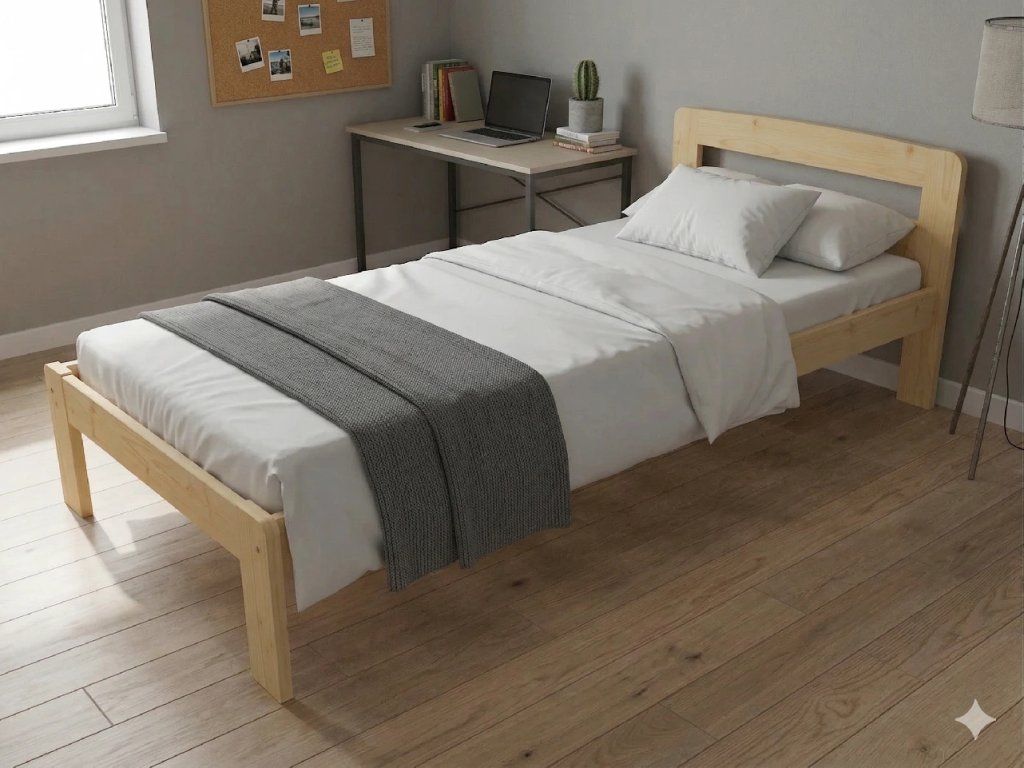 Dřevěná postel 90x200 cm z masivní borovice – VMK8A nabízí pevnost, komfort a přírodní eleganci. Je ideální pro menší ložnice, studentské pokoje nebo hostinské místnosti, kde je důležitá stabilita a dlouhá životnost. Postel je dodávána včetně laťového roštu