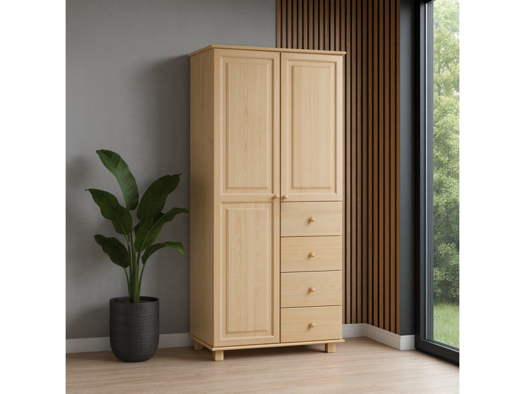 Dřevěná šatní skříň CLASSIC SZ-65c z masivu borovice představuje spojení nadčasového designu, poctivého řemeslného zpracování a dlouhé životnosti. Díky šířce 80 cm je ideální volbou do ložnice, dětského pokoje, předsíně i na chalupu, kde nabídne dostatek úložného prostoru při zachování kompaktních rozměrů.