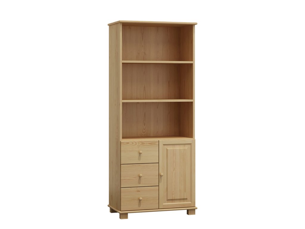 Dřevěný policový regál CLASSIC RW-67a z masivu borovice představuje nadčasové a praktické řešení úložného prostoru do obývacího pokoje, pracovny i ložnice. Kombinace otevřených polic, uzavřené skříňky a zásuvek nabízí dostatek místa pro knihy, dokumenty, dekorace i další vybavení domácnosti.
