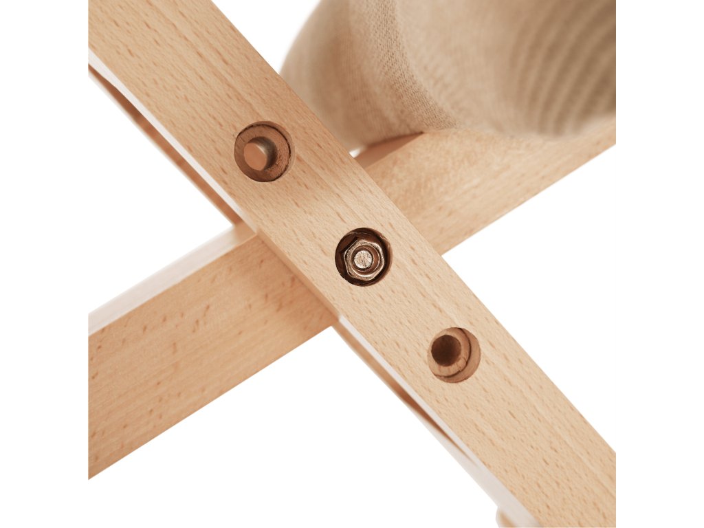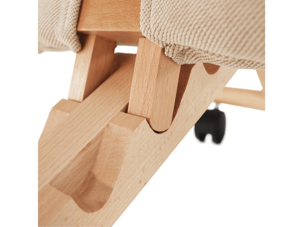Kompaktní rozměry: 46×65×56–72 cm, kombinace krémového čalounění a bukového dřeva se hodí do každého interiéru.