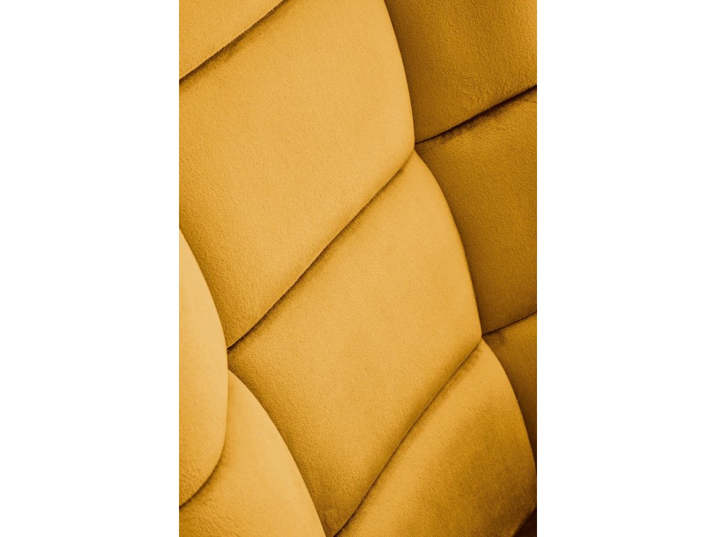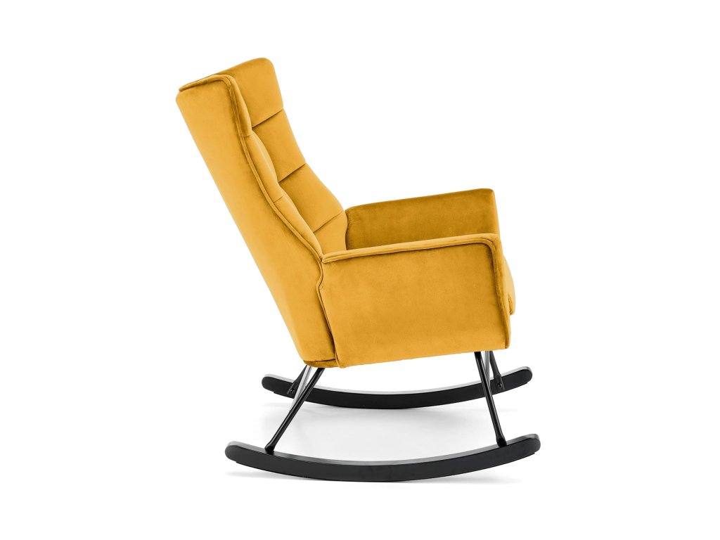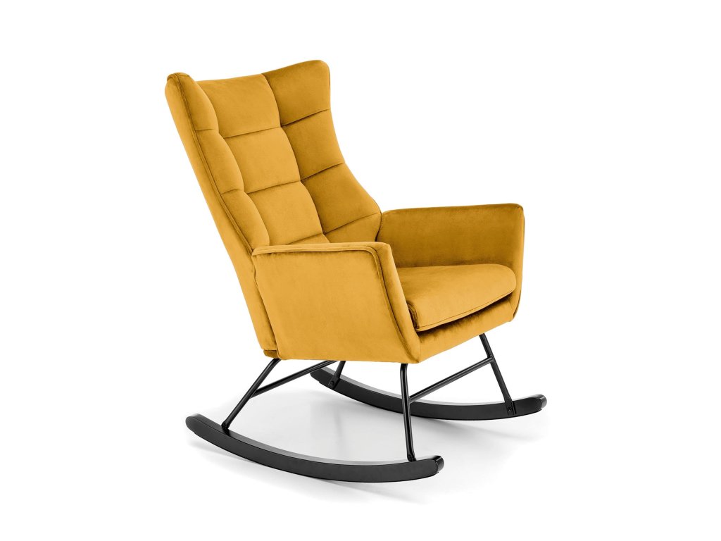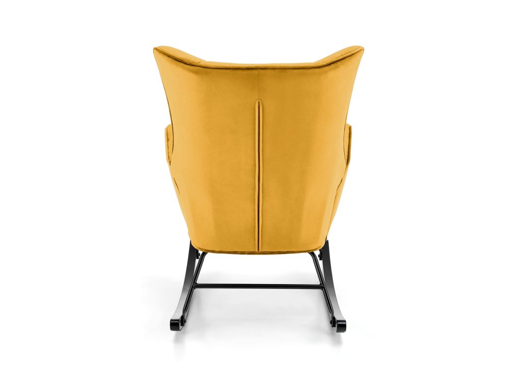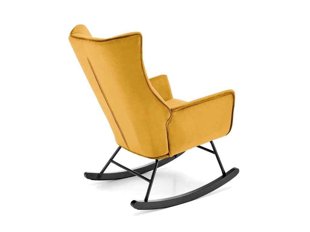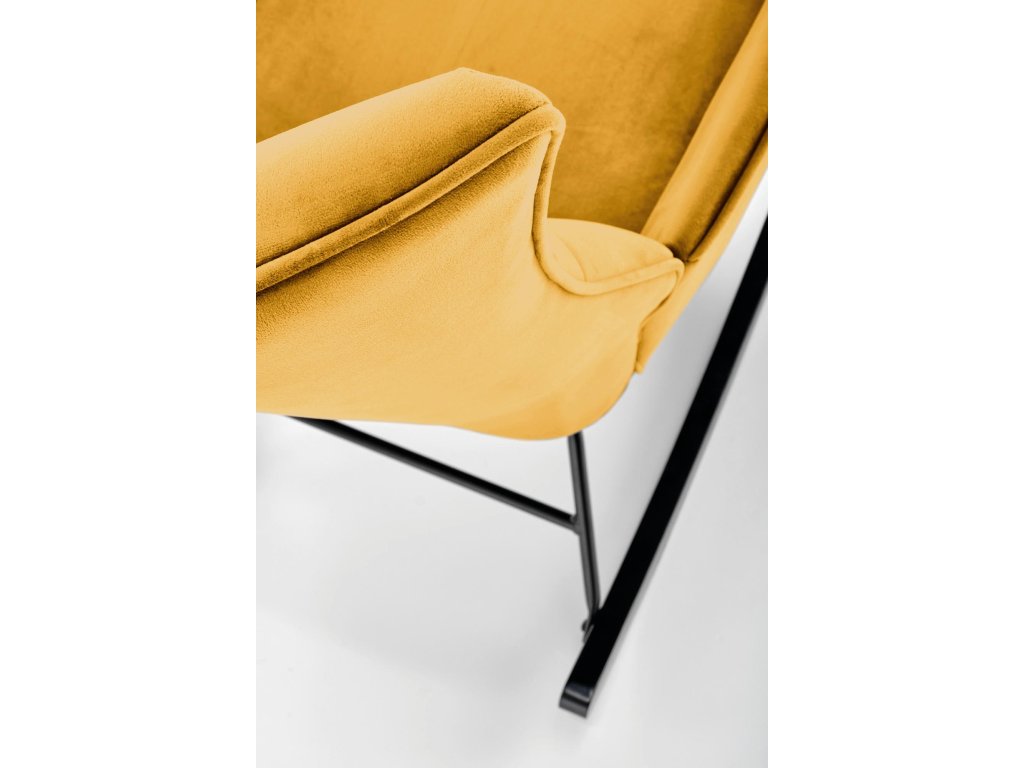 Houpací křeslo LOGAN je čalouněno měkkou hořčicově žlutou sametovou látkou, která do interiéru vnáší hřejivou a stylovou atmosféru. Sametový potah je příjemný na dotek, elegantně se leskne a dodává celému křeslu luxusní vzhled. Kvalitní houpací podnož z práškově lakované oceli a masivního černého dřeva zajišťuje stabilitu a dlouhou životnost.