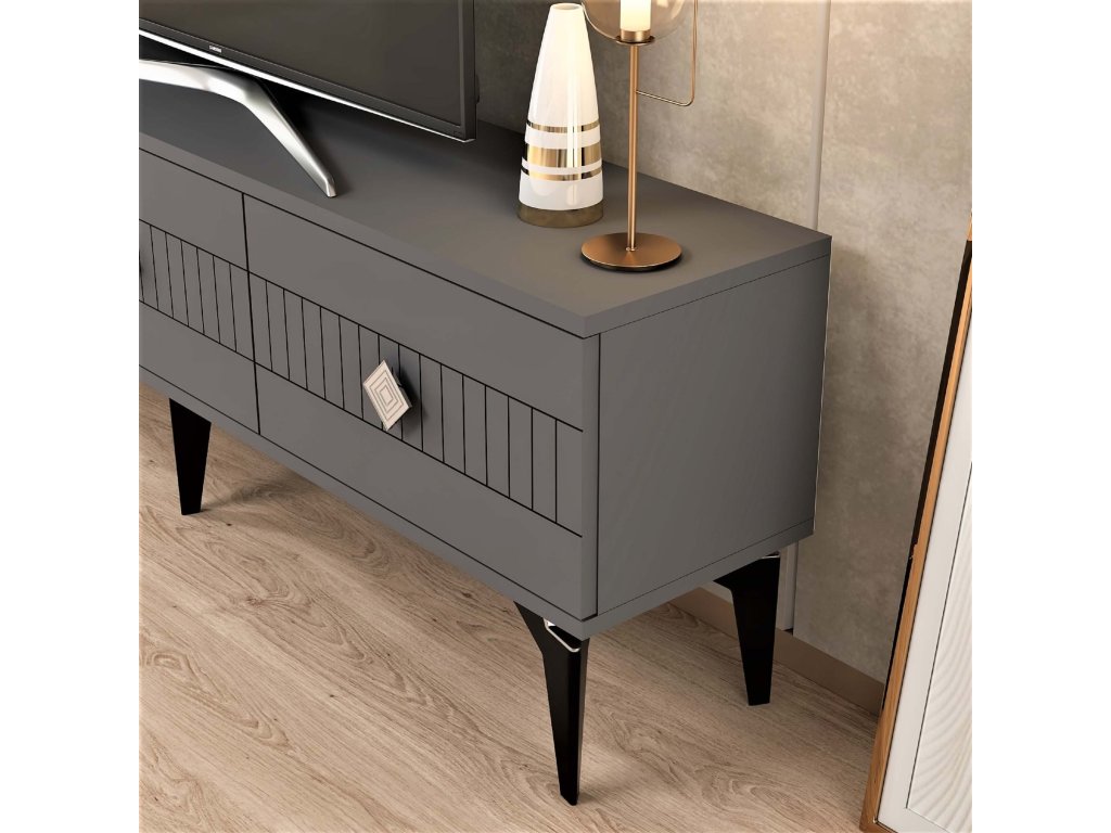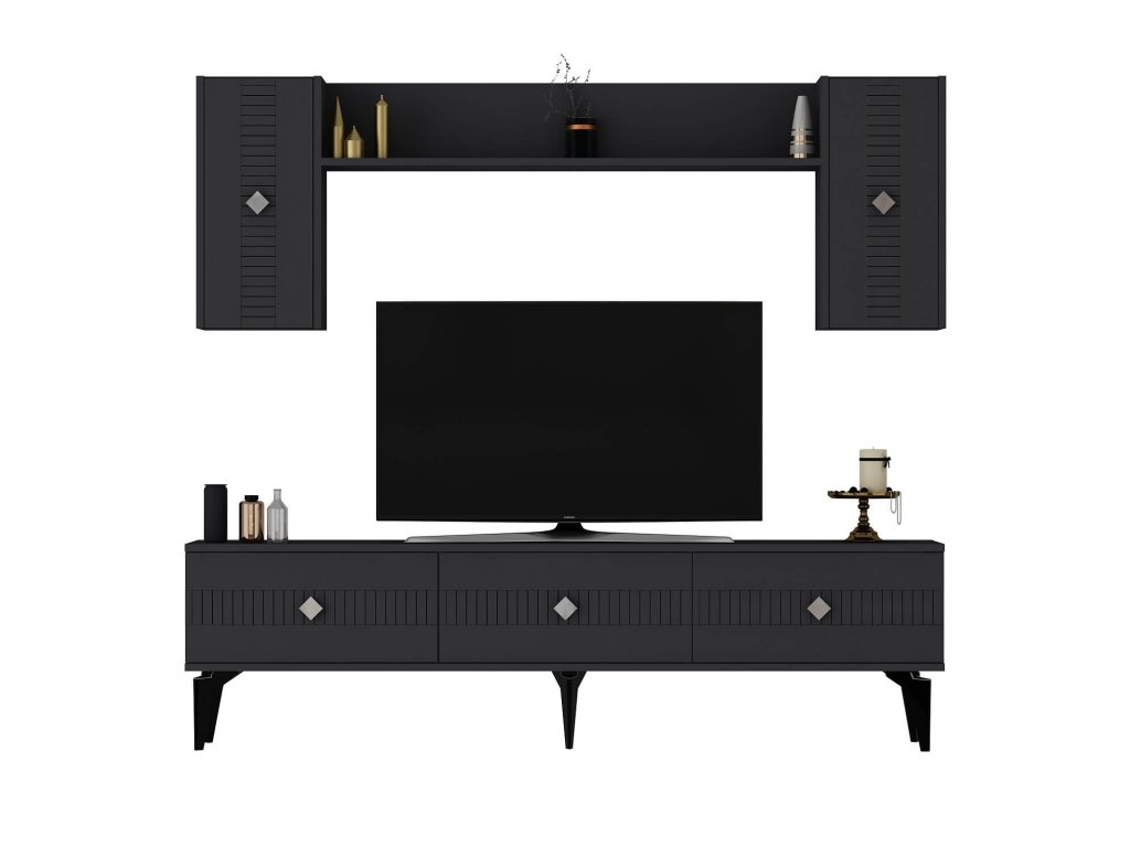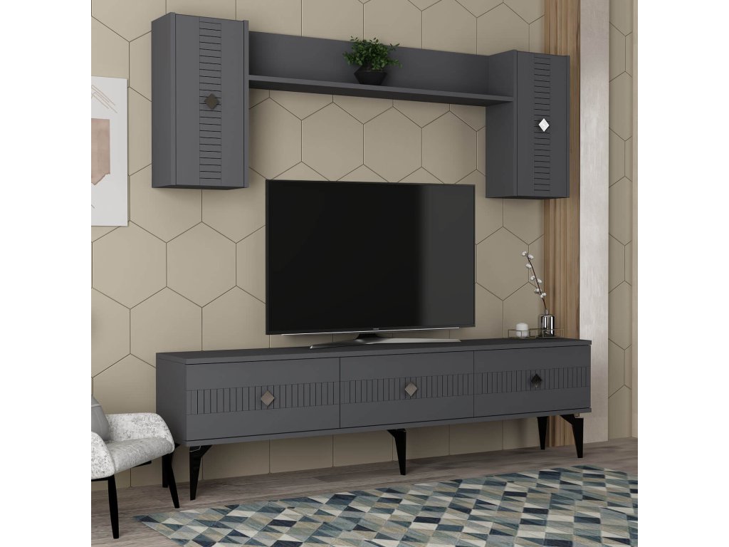 Obývací stěna JARIF je ideálním řešením pro moderní a stylové vybavení vašeho obývacího pokoje. Kombinace elegantního antracitu a stříbrných prvků dodává interiéru nadčasový a sofistikovaný vzhled. Praktická sestava nabízí dostatek úložného prostoru a přehledné uspořádání pro vaše potřeby.