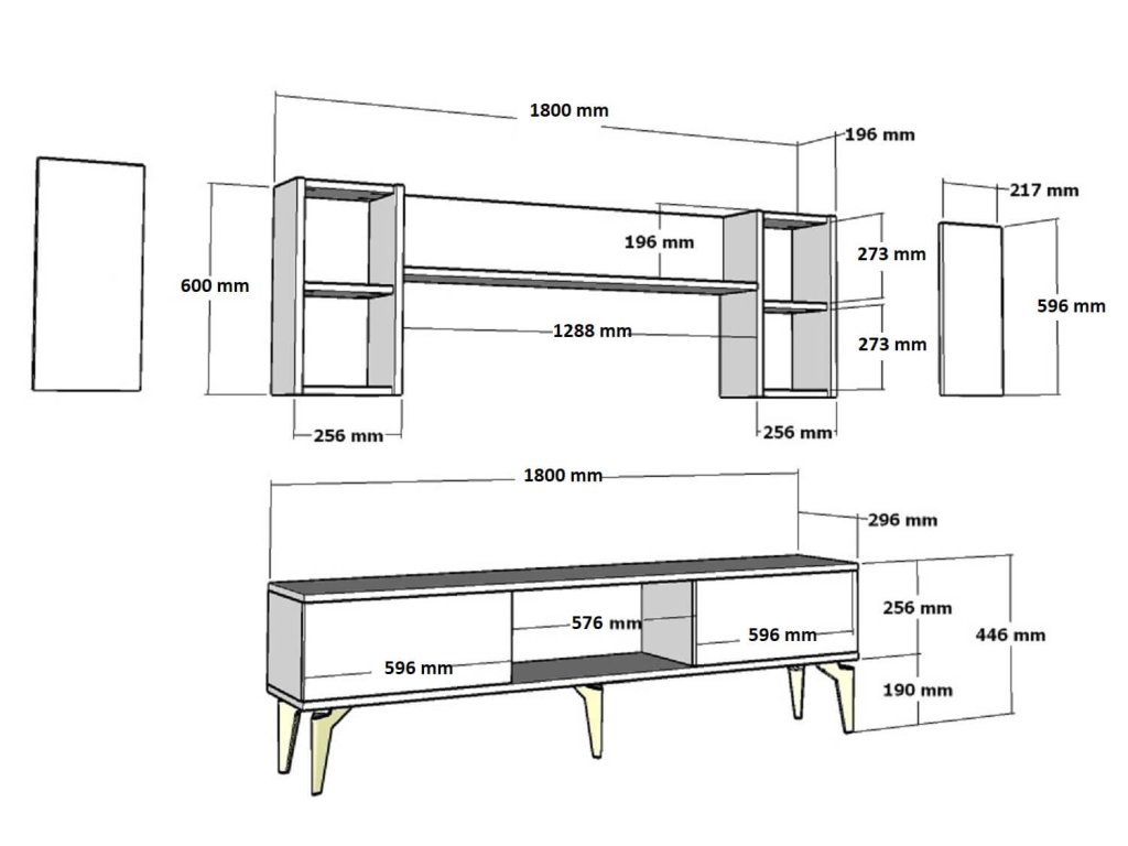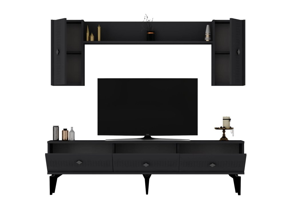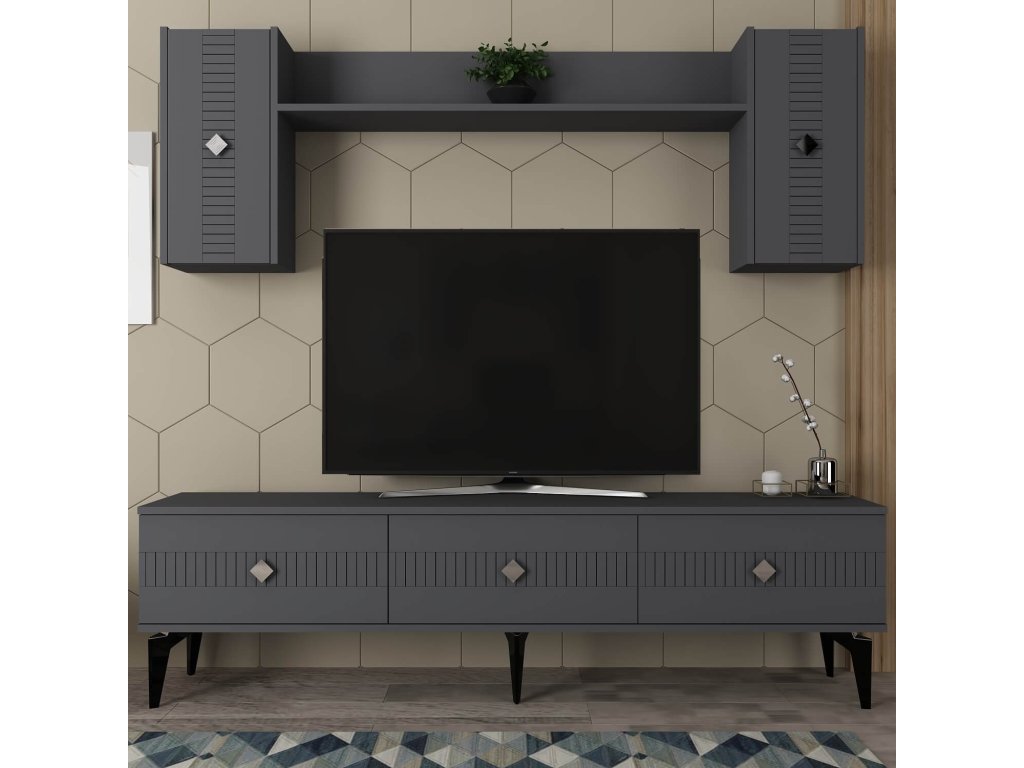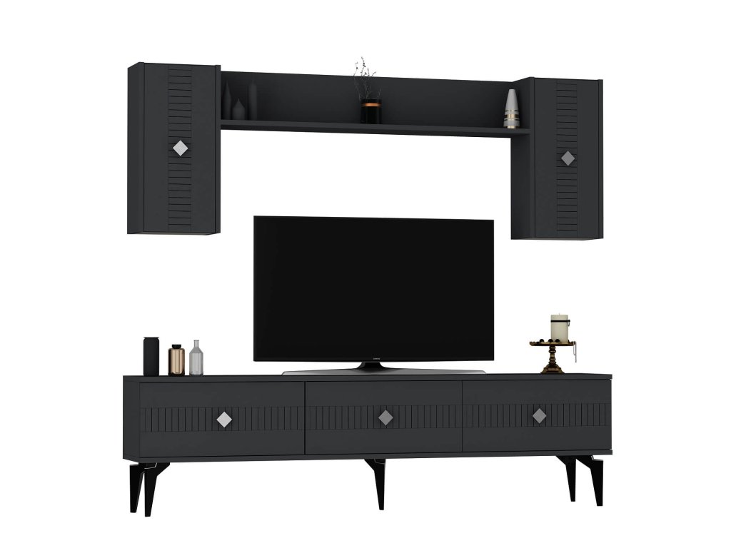 Sestava obsahuje TV stolek, nástěnnou polici a dvě závěsné skříňky