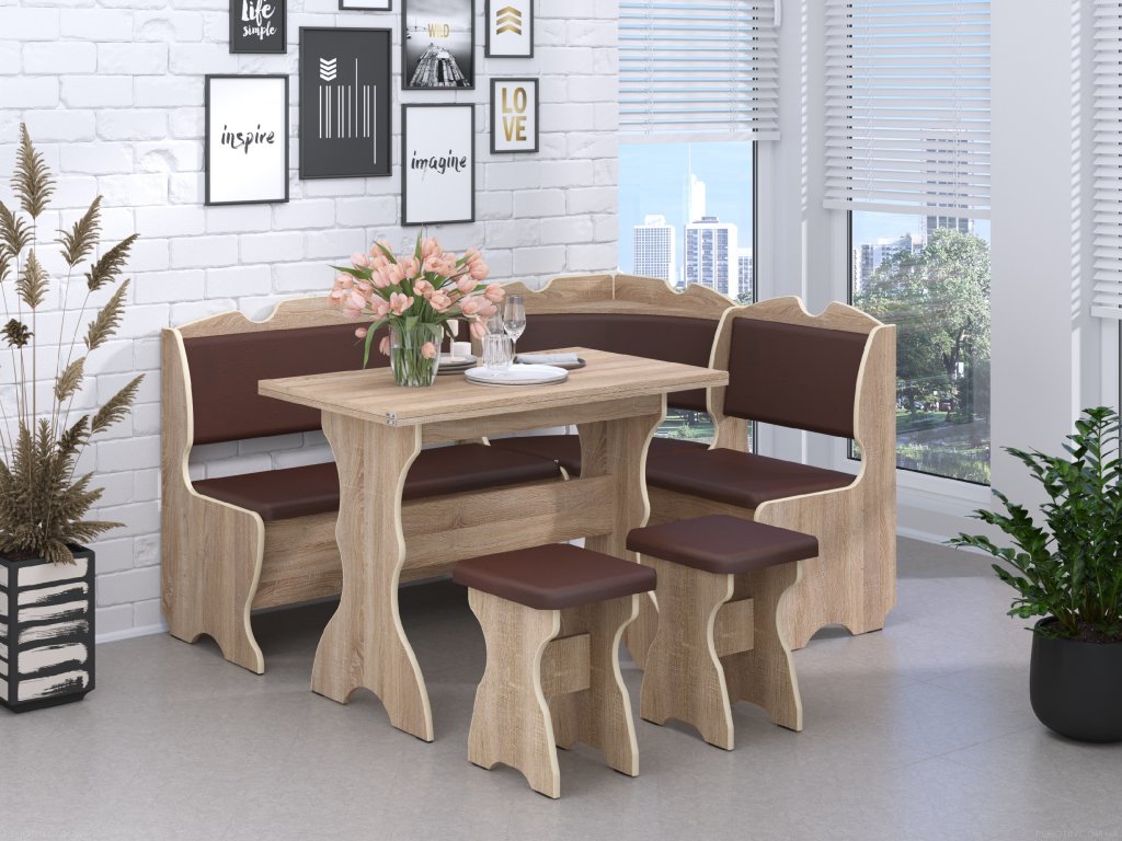 Jídelní rohový set ERLEND spojuje moderní vzhled, praktičnost a komfort v jednom. Kombinace dekoru dub sonoma a čalounění v elegantní hnědé kožence vytváří příjemnou atmosféru vhodnou do kuchyní i jídelen všech velikostí. Součástí setu je rohová lavice ERLEND, rozkládací jídelní stůl SR-01 a 2x taburet T-1.