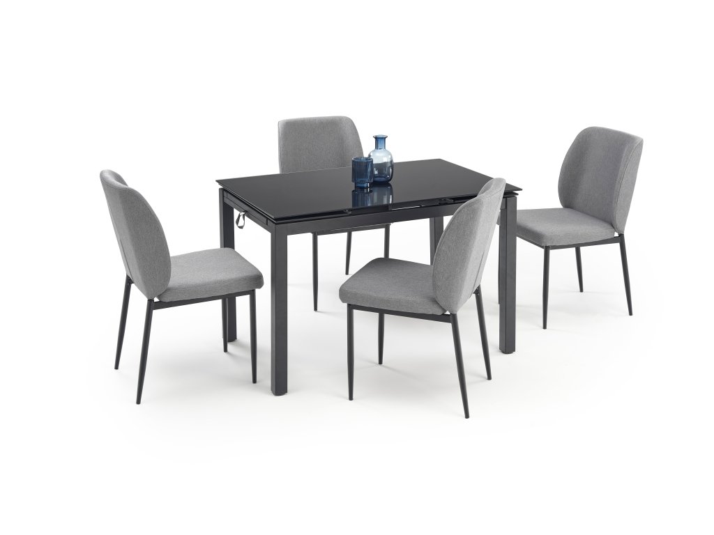 Jídelní set KLAYVER 4+1 představuje dokonalé spojení minimalistického designu a praktické funkčnosti. Skládá se z obdélníkového stolu s černou skleněnou deskou a čtyř šedých židlí, které jsou čalouněné kvalitní látkou. Tento set je ideální pro moderní domácnosti, které hledají elegantní a zároveň pohodlný nábytek do jídelny nebo kuchyně.