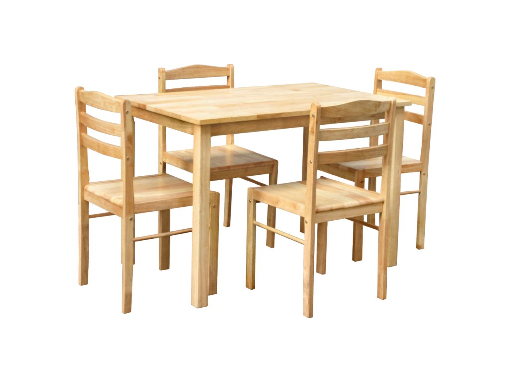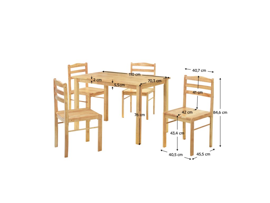Set je ideální pro 4 osoby a skládá se z jednoho jídelního stolu a čtyř židlí. Díky svým kompaktním rozměrům je vhodný i do menších jídelen nebo kuchyní, aniž by ztrácel na pohodlí a funkčnosti.