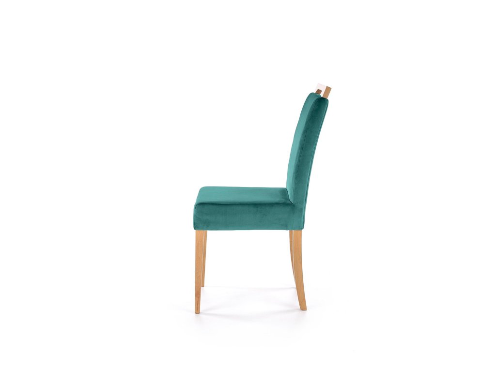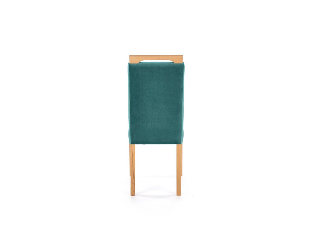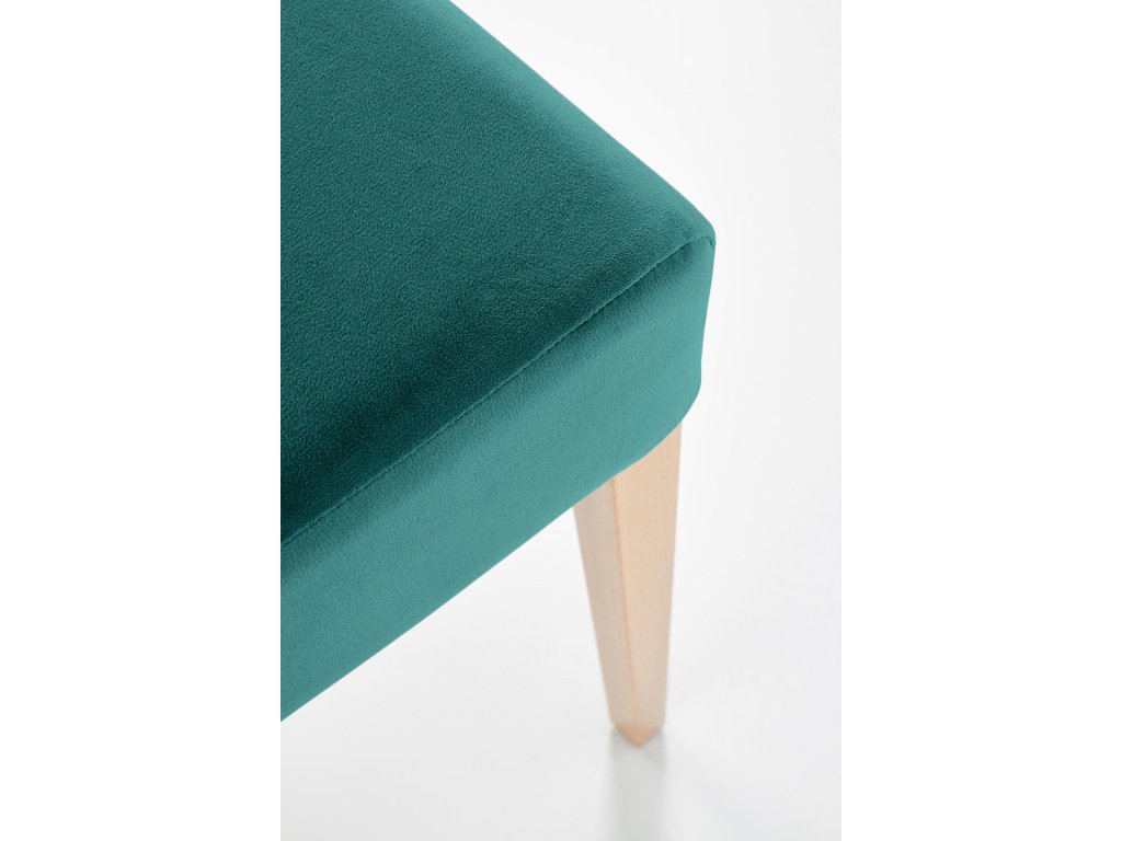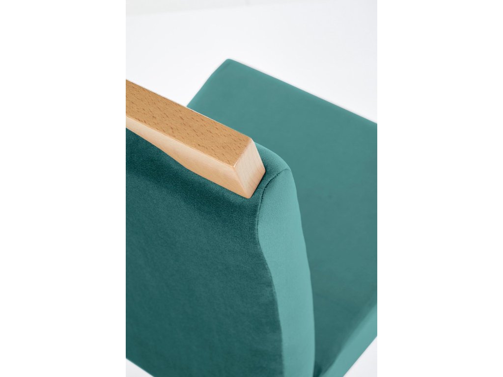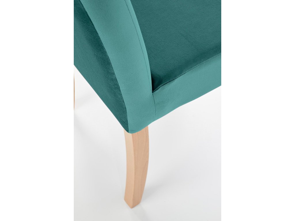 Čalounění z jemného veluru v sytě zeleném odstínu působí luxusně a zároveň útulně. Potah je měkký, příjemný na dotek a snadno udržovatelný. Černé nohy z masivního bukového dřeva dodávají židli stabilitu, pevnost a kontrastní charakter. Vysoký opěrák s madlem po celé šířce umožňuje snadnou manipulaci a podtrhuje propracovaný vzhled židle. Područky zajišťují pohodlné sezení i při delším stolování.