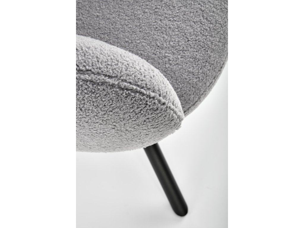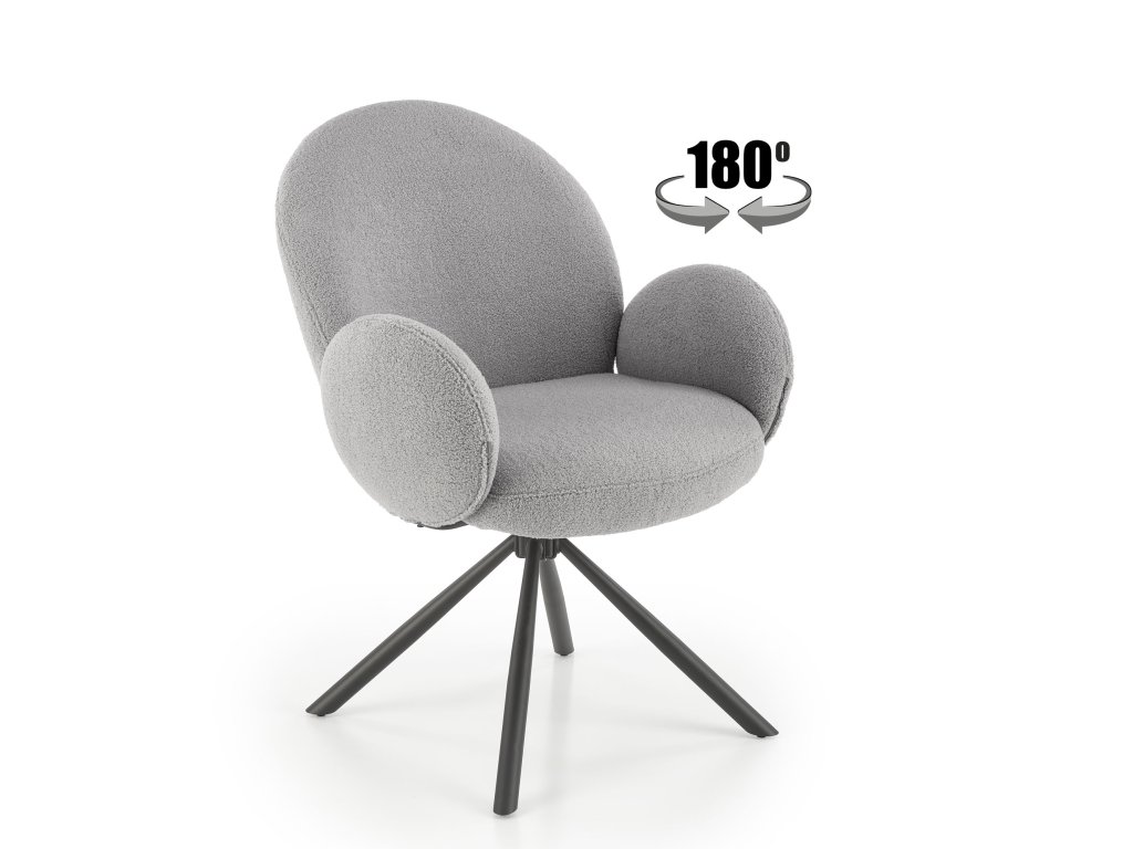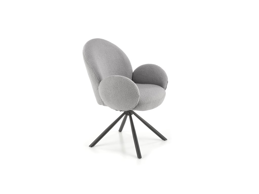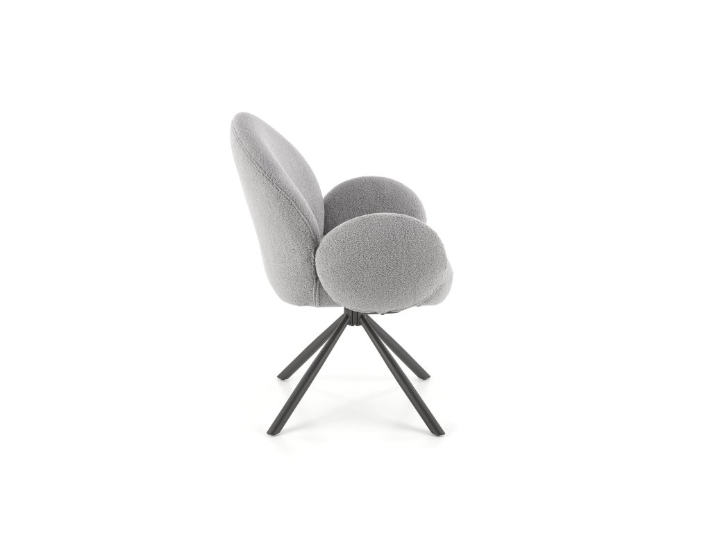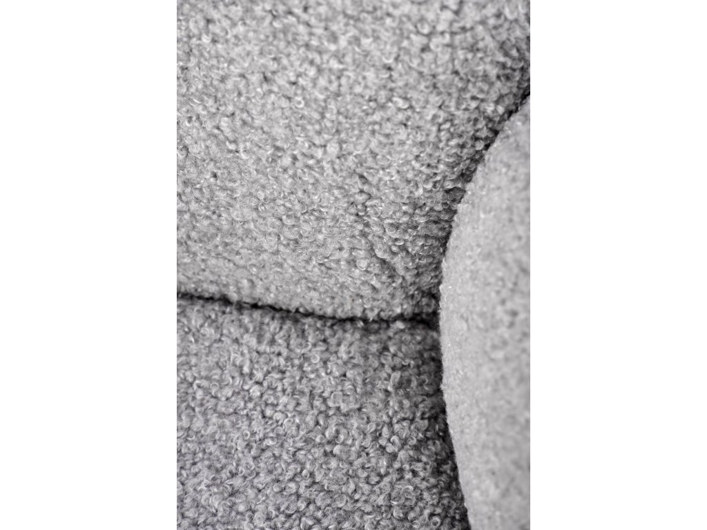 Otočná jídelní židle / křeslo VMK498 v elegantní šedé barvě vyniká osobitým vzhledem, který kombinuje funkčnost s moderním stylem. Je čalouněná kvalitní látkou bouclé – měkkým, strukturovaným materiálem s charakteristickými uzly, které dodávají židli jedinečný vzhled a nádech elegance.