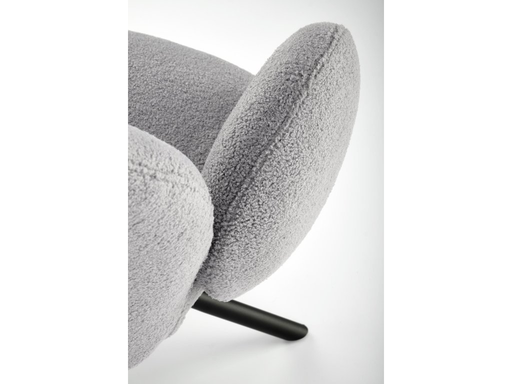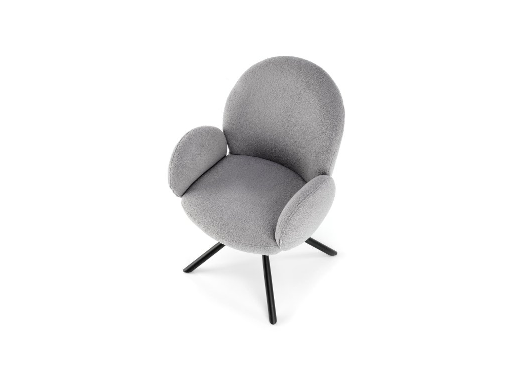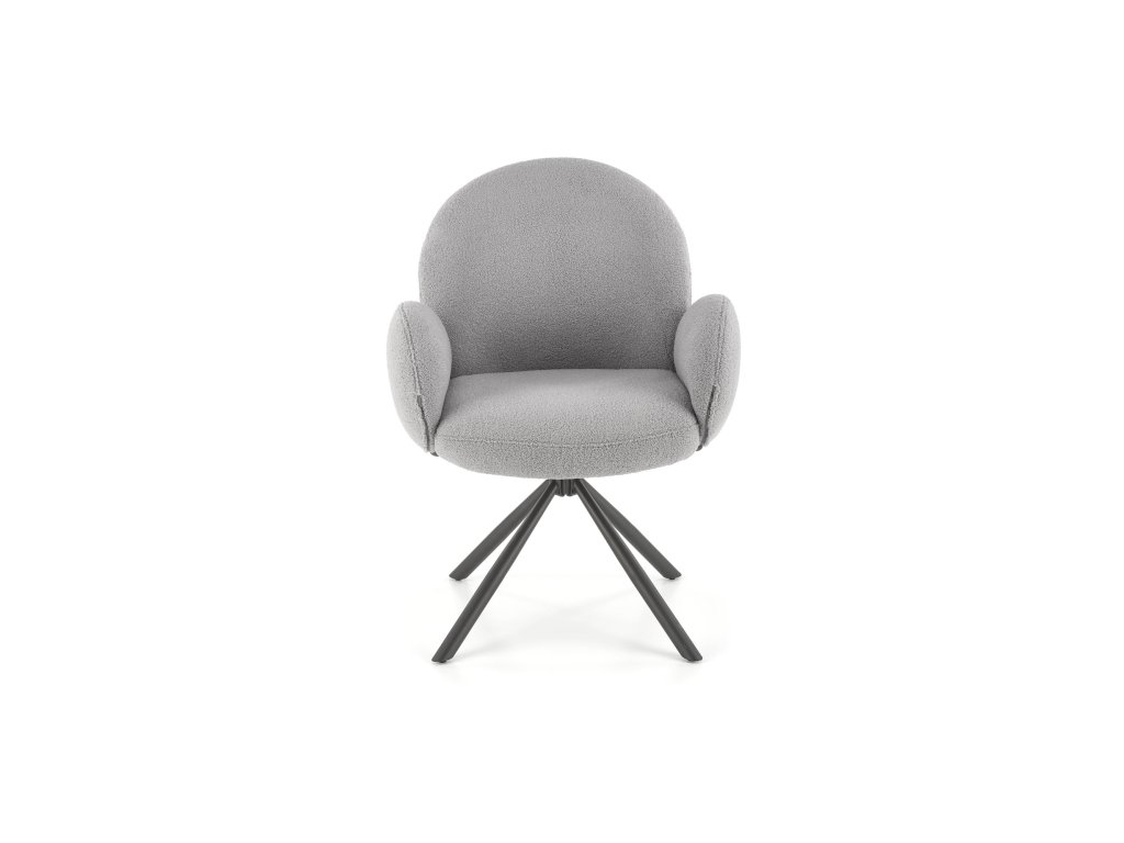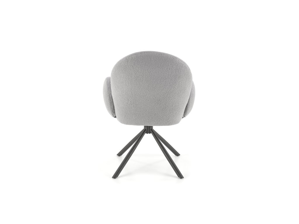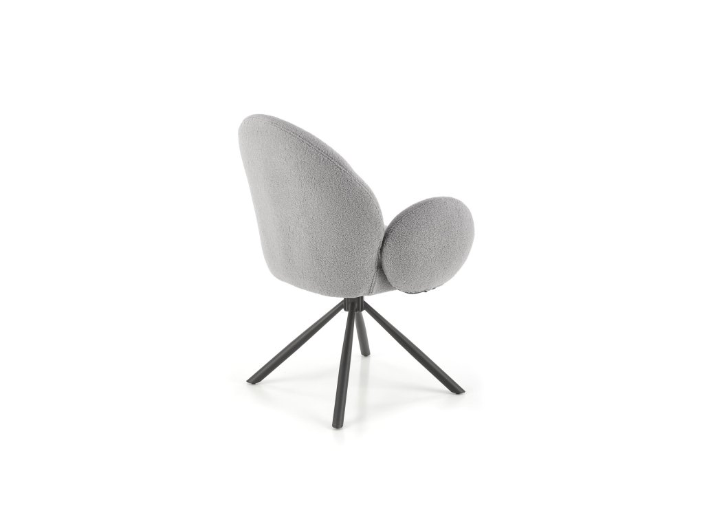 Otočná jídelní židle / křeslo VMK498 v elegantní šedé barvě vyniká osobitým vzhledem, který kombinuje funkčnost s moderním stylem. Je čalouněná kvalitní látkou bouclé – měkkým, strukturovaným materiálem s charakteristickými uzly, které dodávají židli jedinečný vzhled a nádech elegance.