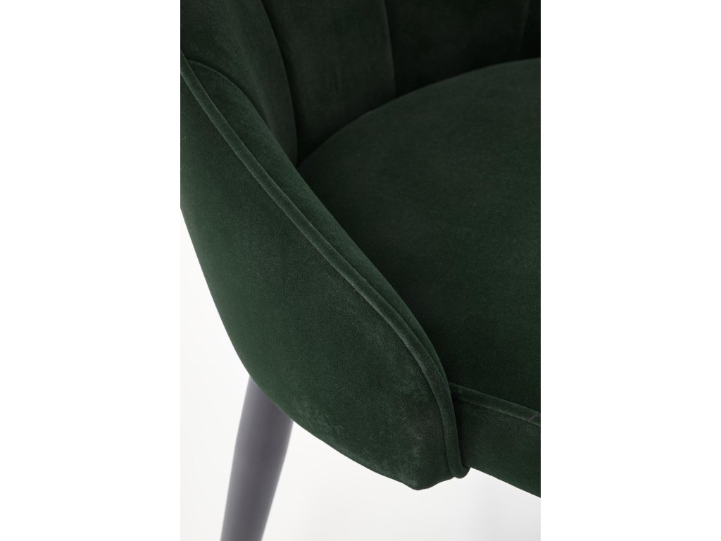 Čalounění z hebké sametové látky v módním odstínu zelené působí luxusně a zároveň je příjemné na dotek. Díky ergonomicky tvarovanému opěradlu a komfortní výšce sedu nabízí židle vysoké pohodlí i při delším sezení. Pevné kovové nohy s černou práškovou úpravou zajišťují stabilitu, dlouhou životnost a nosnost až 100 kg.