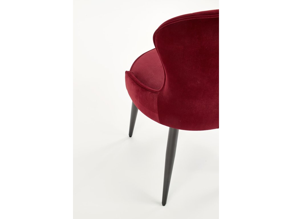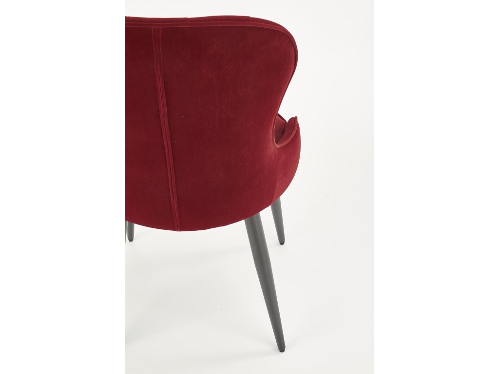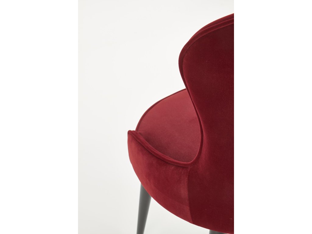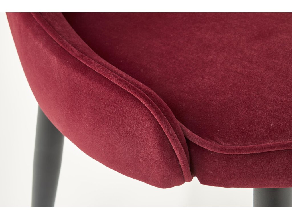 Jídelní židle VMK366 v bordo sametu přináší dokonalou kombinaci moderního designu a klasických prvků. Její neobvyklý tvar v kombinaci s ozdobným prošíváním na opěradle odkazuje na Ludvíkovu eleganci a dodává každému interiéru luxusní nádech. Oboustranné čalounění sametovou látkou vytváří atraktivní efekt lesku při dopadu světla, což podtrhuje exkluzivní charakter židle.