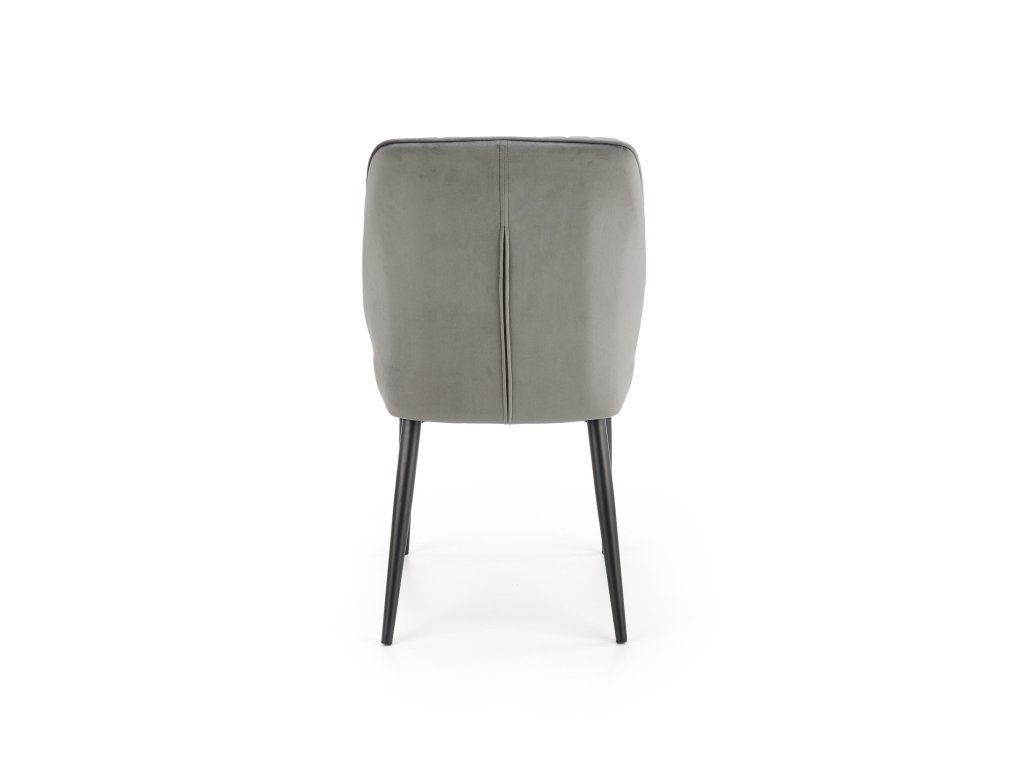 Židle je potažená sametovou látkou, která je příjemná na dotek a dodává nábytku luxusní charakter. Tvarované opěradlo s výrazným vertikálním prošíváním poskytuje ergonomickou oporu zad, čímž zajišťuje pohodlné sezení i při delším stolování. Konstrukce z černé práškově lakované oceli dodává židli stabilitu a odolnost.