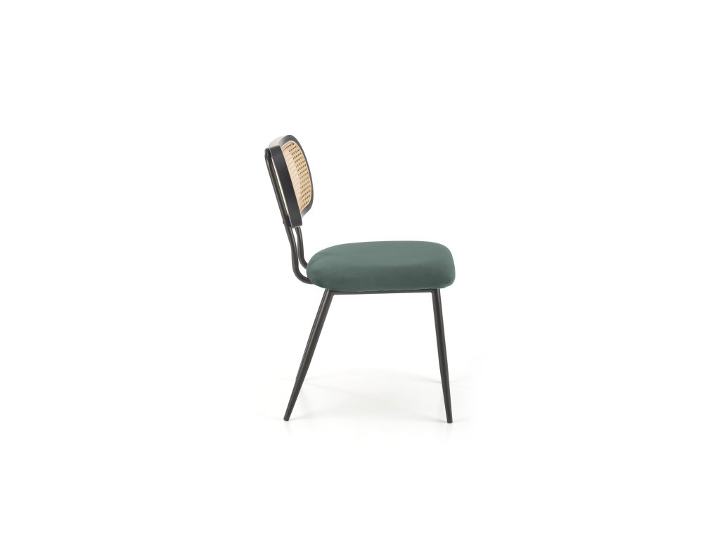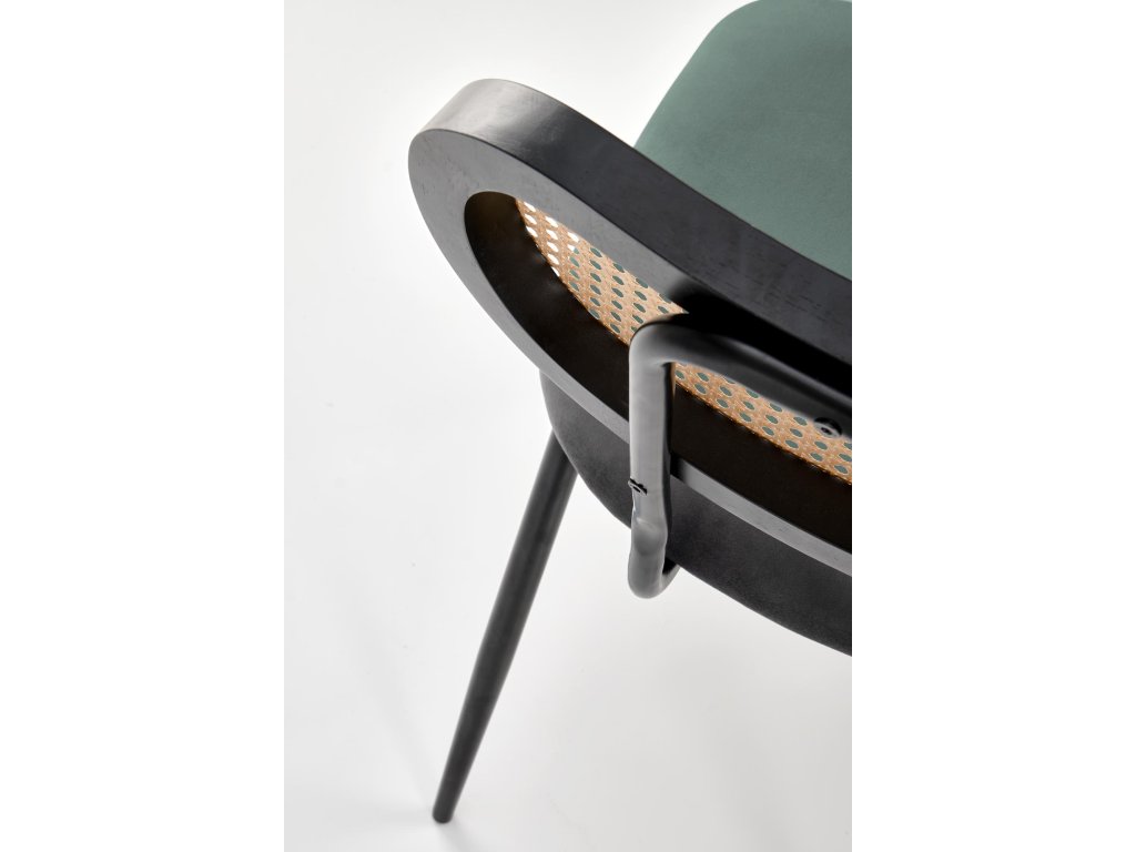 Jídelní židle VMK503 v tmavě zelené barvě je kombinací jedinečného designu a kvalitních materiálů. Opěrák z technoratanu v podobě vídeňského výpletu je zasazen do zaobleného rámu z masivního kaučukového dřeva, lakovaného na černo. Tato kombinace přírodních a moderních materiálů dodává židli nadčasový vzhled, který osloví i ty nejnáročnější. Sedák potažený tmavě zelenou sametovou látkou se jemně leskne na světle, což přidává nábytku nádech elegance.