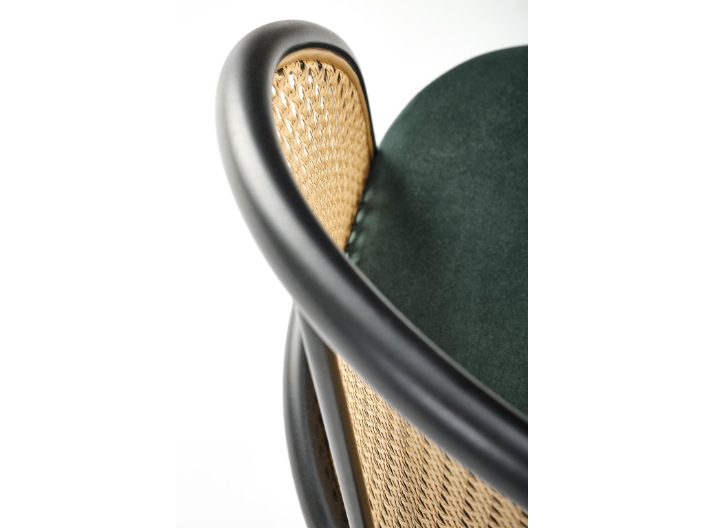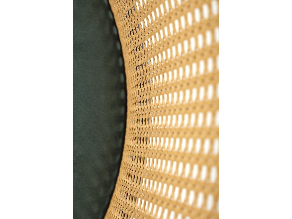 Moderní design: Tmavě zelený samet a přírodní rattanový opěrák v kombinaci s černými kovovými nohami přináší elegantní vzhled, který se hodí do různých interiérů.
