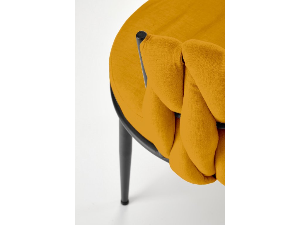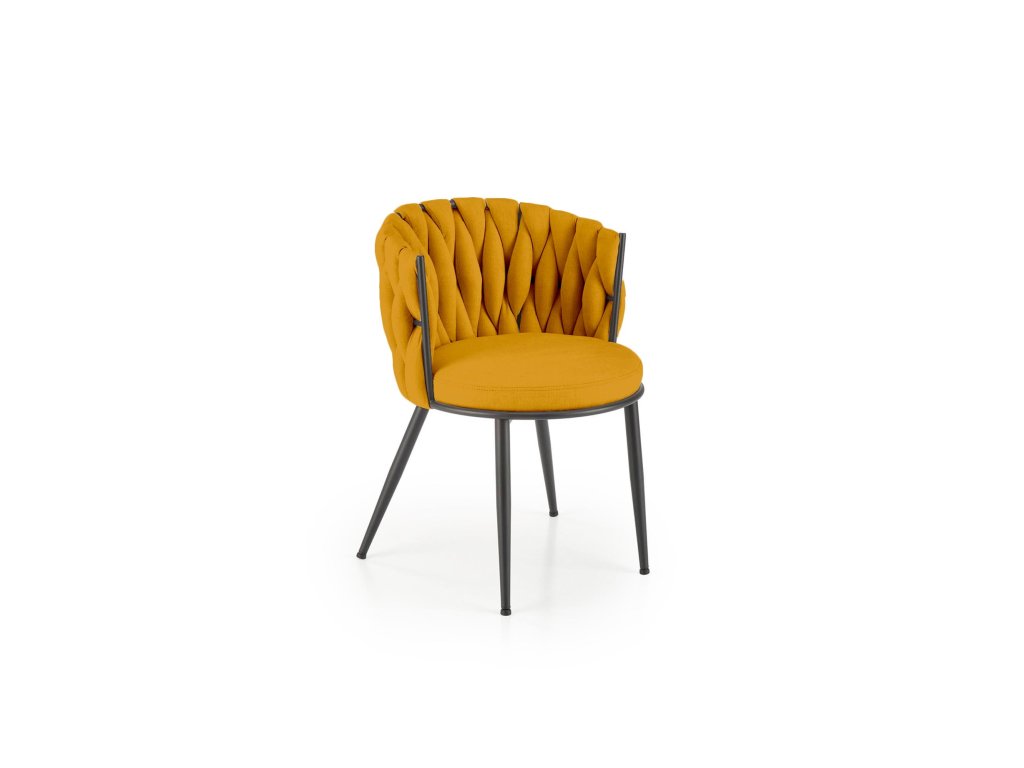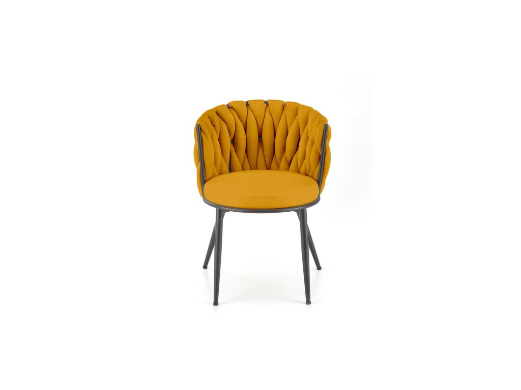 Židle VMK516 je elegantní designový prvek, který do vašeho domova vnese teplý akcent, styl a praktičnost. Kombinace výrazné hořčicové látky a originálního tkaného opěradla z ní dělá nejen funkční, ale i vizuálně poutavý kus nábytku. Stabilní černě lakovaná kovová podnož zajišťuje pevnost a odolnost při každodenním používání.