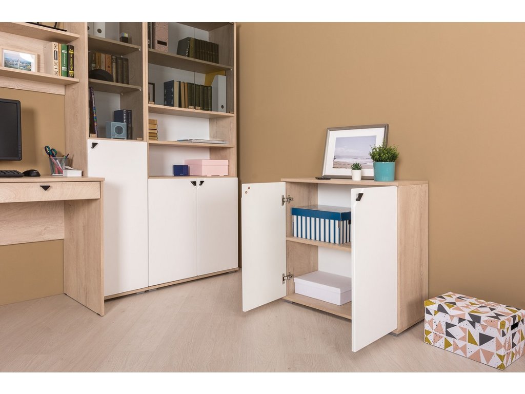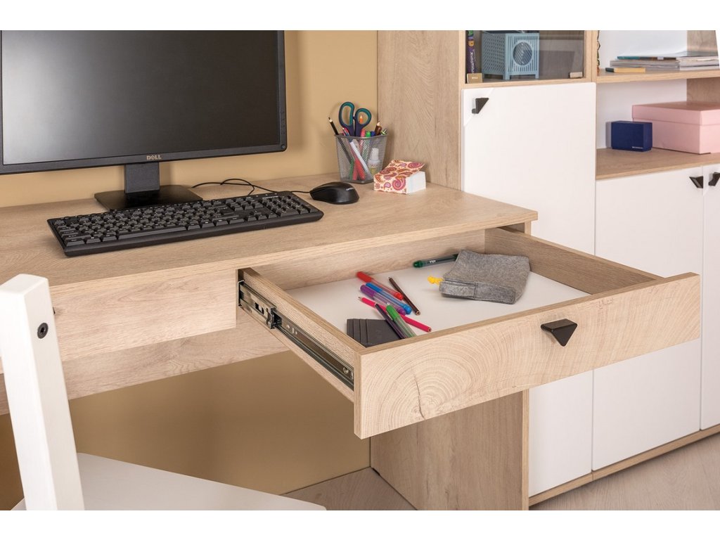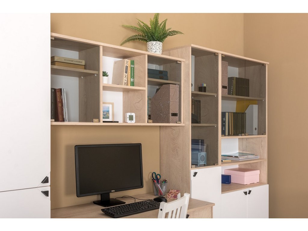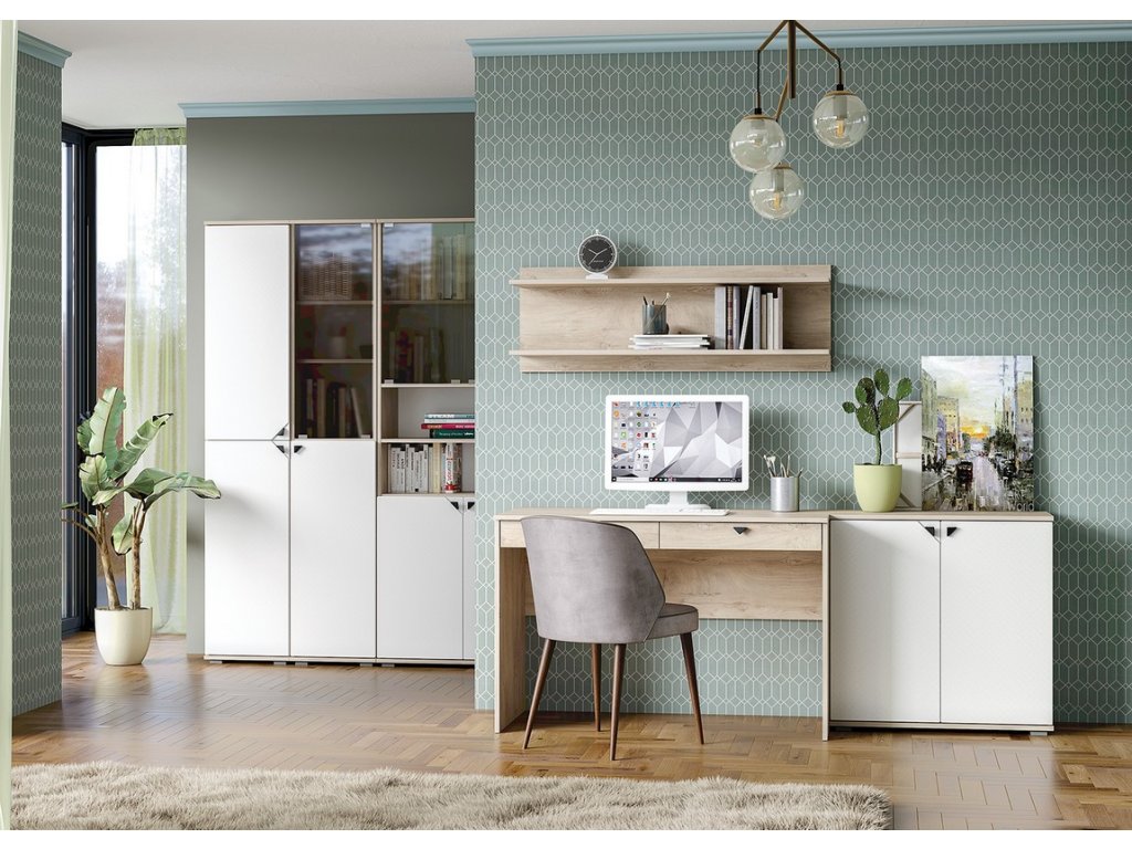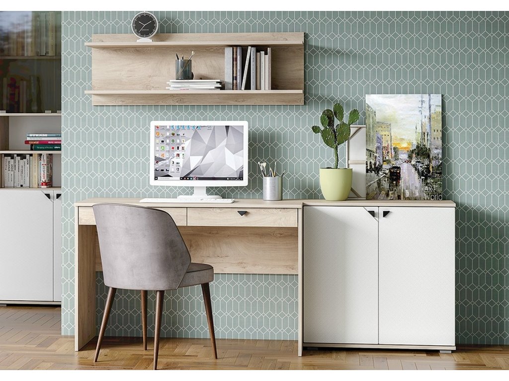 Kancelářská sestava, korpus je v barvě dub endgrain elegance, dvířka a čela zásuvek jsou z MDF v barvě milk rikamo soft. Sestava se skládá z těchto komponentů ( Š x V x H cm ) - pracovní stůl se 2 zásuvkami ( 115 x 76 x 57 ), závěsná police ( 115 x 39 x 26 ) a komoda dvoudveřová s 1 policí uvnitř ( 77 x 76 x 35 ). Úchyty jsou kovové. Dodáváme v demontovaném stavu. DOPRODEJ!
