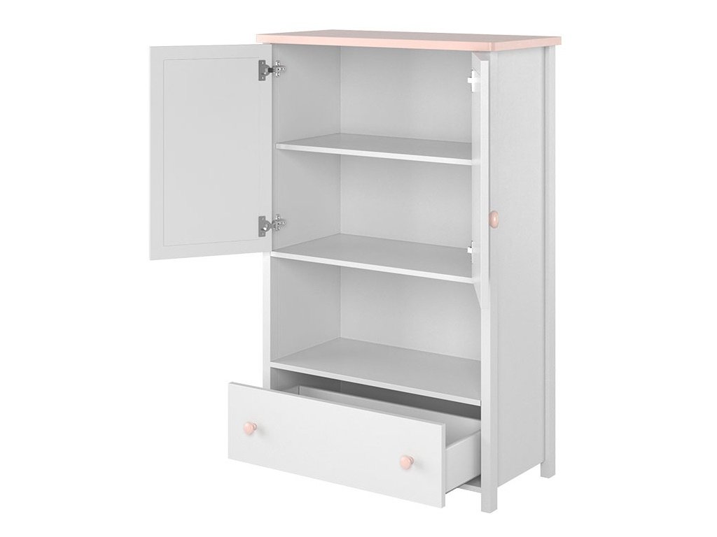 Komoda má dvířka v horní části a prostornou zásuvku ve spodní části, což poskytuje dostatek úložného prostoru pro oblečení, hračky nebo školní potřeby. Plastové úchyty v růžové barvě zajišťují snadné a bezpečné otevírání zásuvky i dvířek.
