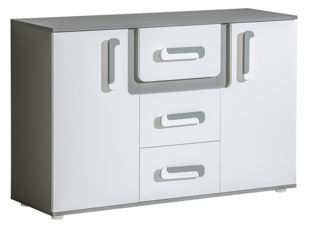 Hledáte moderní a praktický nábytek do dětského nebo studentského pokoje? Komoda do dětského pokoje SOLETTA 7 je ideální volbou. Kombinace antracitového korpusu a bílých dvířek působí elegantně a zároveň svěže – perfektně zapadne do pokoje menších dětí i dospívajících.