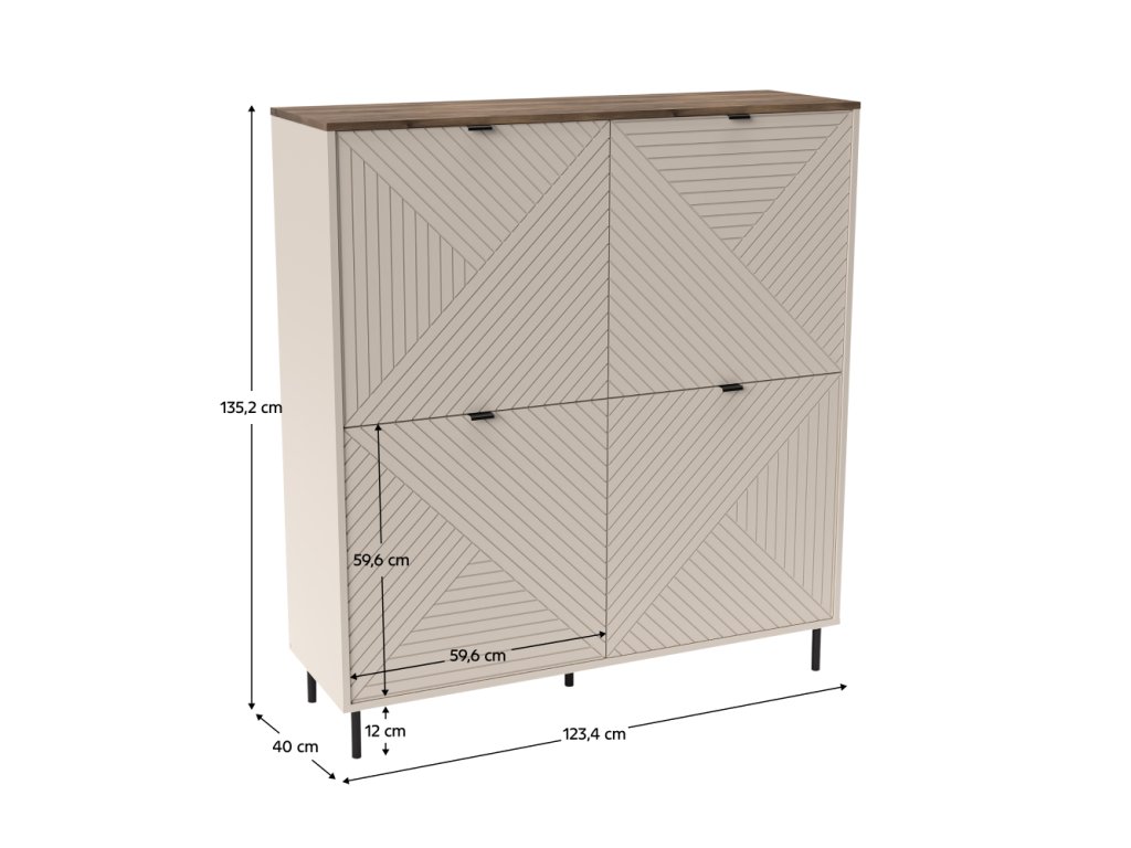 Rozměry komody jsou 123,4 × 40 × 135,2 cm, tloušťka materiálu 1,6 cm. Komoda SAIDY 4D spojuje moderní design, funkčnost a odolné materiály, které zajišťují kvalitu a dlouhodobou spokojenost s produktem.