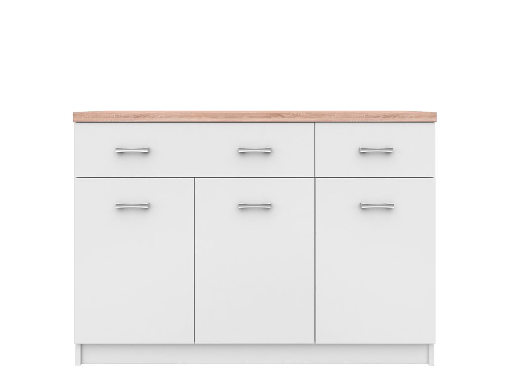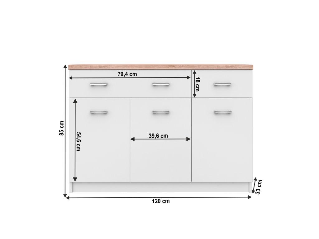 Vyrobena z kvalitní laminované DTD, disponuje korpusem o tloušťce 16 mm a pevnou vrchní deskou o tloušťce 32 mm, která zajišťuje dlouhou životnost a odolnost proti běžnému opotřebení. S rozměry 120 × 33 × 85 cm poskytuje dostatek úložného prostoru díky kombinaci 3 zásuvek a 2 skříněk, které pomáhají udržet věci přehledně uspořádané.